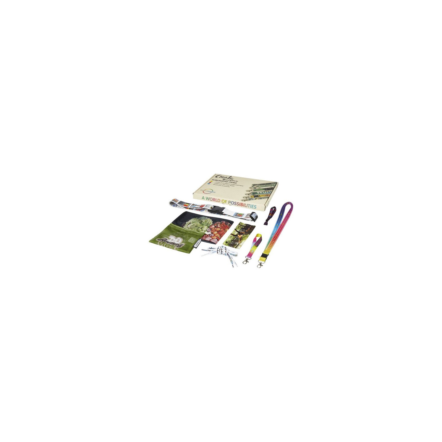 - La box campionatura stampa in sublimazione comprende 3 sacchetti per frutta o verdura di diverse dimensioni (15 x 21 cm - 1PL035, 25 x 32 cm - 1PL036, 30 x 41 cm - 1PL037), tutti realizzati in poliestere riciclato al 100%