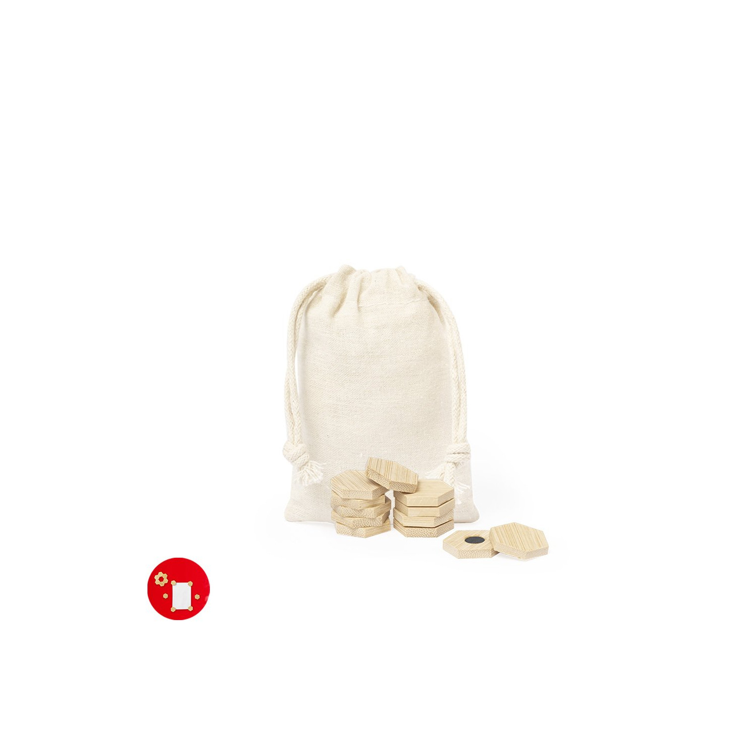 Set di calamite in bambù. Include 12 pezzi pentagonali intagliati nel bambù con magnete per fissare appunti, foto, ecc. su qualsiasi superficie metallica. Presentati in un sacchetto di cotone. Materiali come il bambù favoriscono l'utilizzo di materie prime naturali, riducendo le emissioni inquinanti. Proviene da una pianta altamente resistente e versatile, con una rapida crescita e rigenerazione, rappresentando un'ottima alternativa all'uso del legno tradizionale.