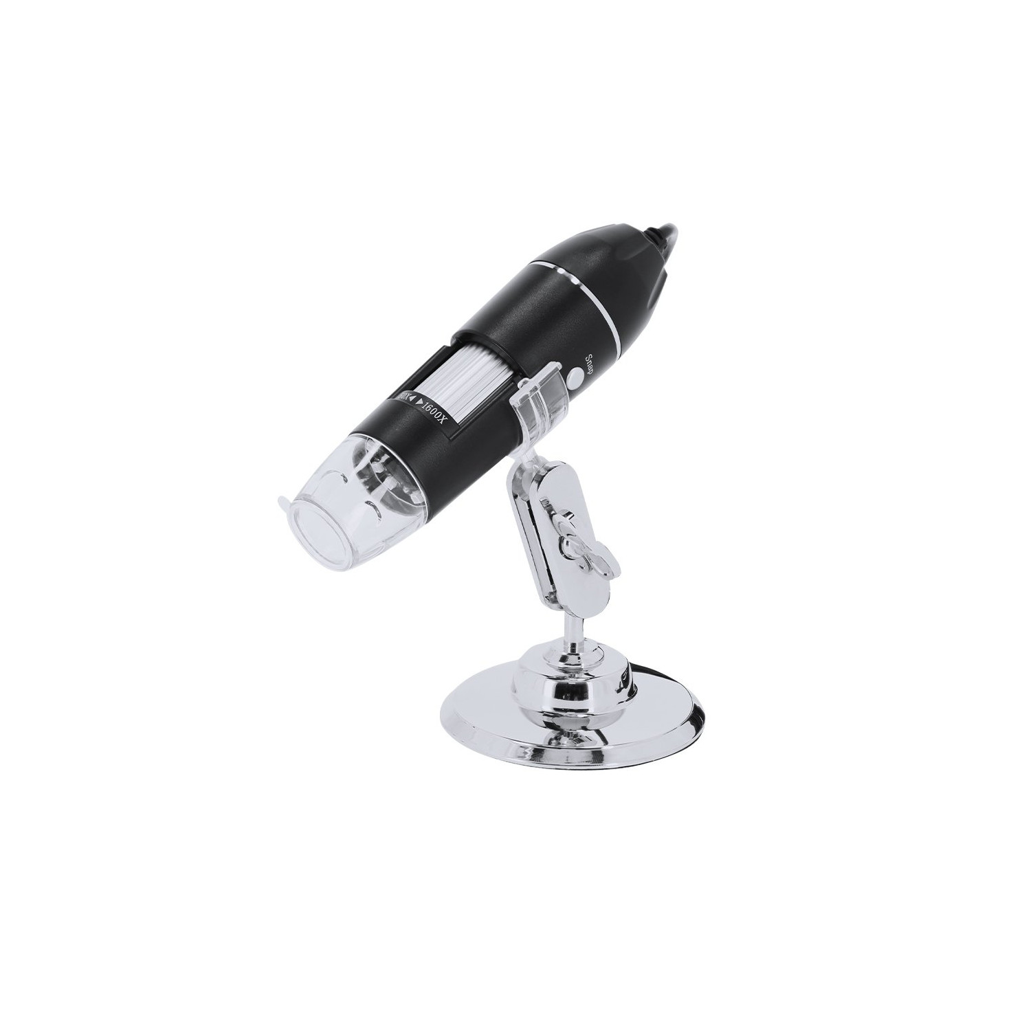 Microscopio digitale compatto con ingrandimento da 0 a 1600X. Luce LED regolabile e risoluzione personalizzabile fino a 1600x1200 manualmente. Include supporto regolabile, cavo di 140 cm con adattatore USB, Tipo C e Micro USB, per l'uso su vari dispositivi. Design elegante in nero opaco con dettagli argentati, compatibile con l'app per Android. Dispone di righello di calibrazione e manuale in spagnolo e inglese.