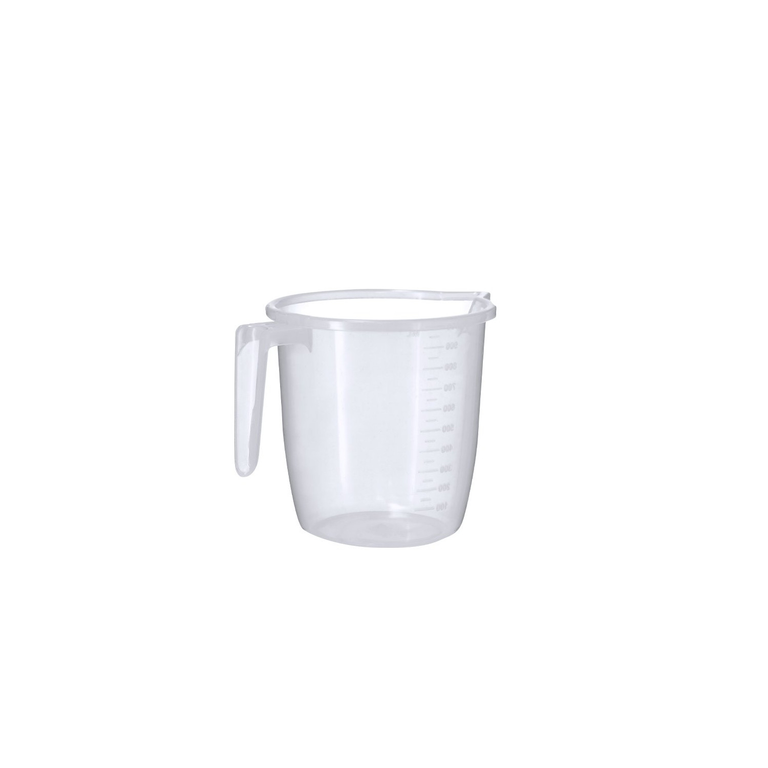 Bicchiere misuratore da 1L realizzato principalmente in resistente PP trasparente con maniglia. Con misuratore laterale in segmenti da 100 ml e 50 ml. Include beccuccio sul bordo per evitare schizzi.