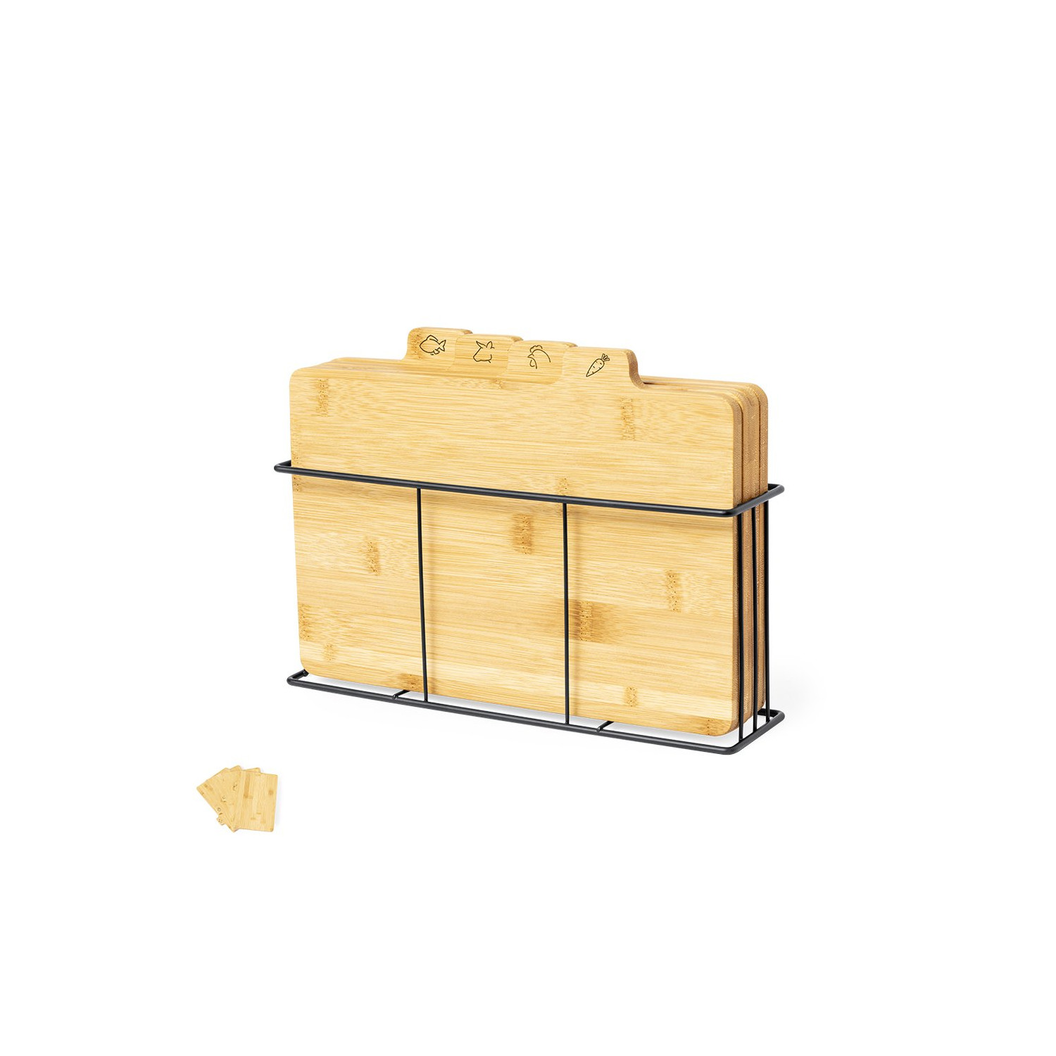 Set di taglieri in bambù, ciascuno facilmente identificabile grazie ai motivi intagliati specifici per pesce, carne bianca, carne rossa e verdure. Include un cestino in metallo con guide per riporli in modo ordinato. Presentato in una scatola kraft di design.Materiali come il bambù favoriscono l'uso di materie prime naturali, riducendo le emissioni inquinanti. Proviene da una pianta altamente resistente e versatile, con una rapida crescita e rigenerazione, rappresentando un'ottima alternativa all'uso del legno tradizionale.