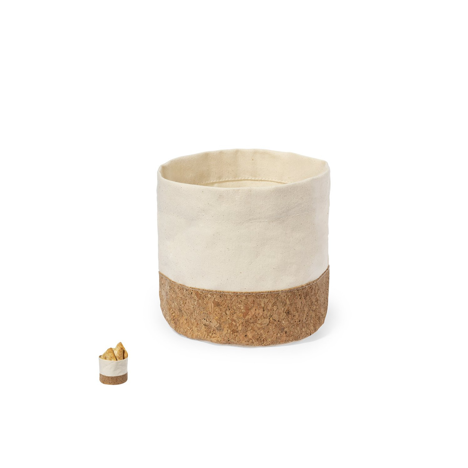 Cestino per il pane in morbido cotone e sughero nella base, con un design rotondo. Presentato in un sacchetto individuale riciclato.Realizzato con elementi di origine vegetale per favorire l'uso di materie prime naturali e ridurre le emissioni inquinanti.