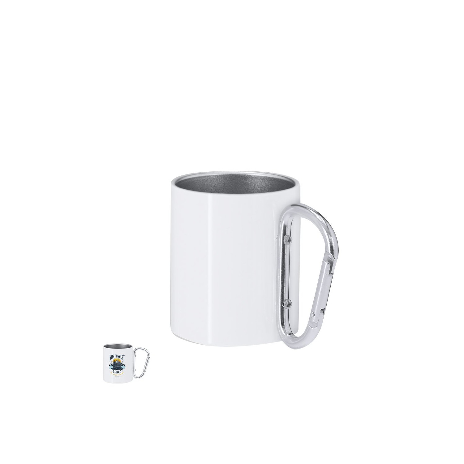 Tazza in acciaio inox di 220 ml, con corpo di finitura bianco brillante metallico e un manico funzionale a forma di moschettone, facile da trasportare. Progettata specificamente per la sublimazione.