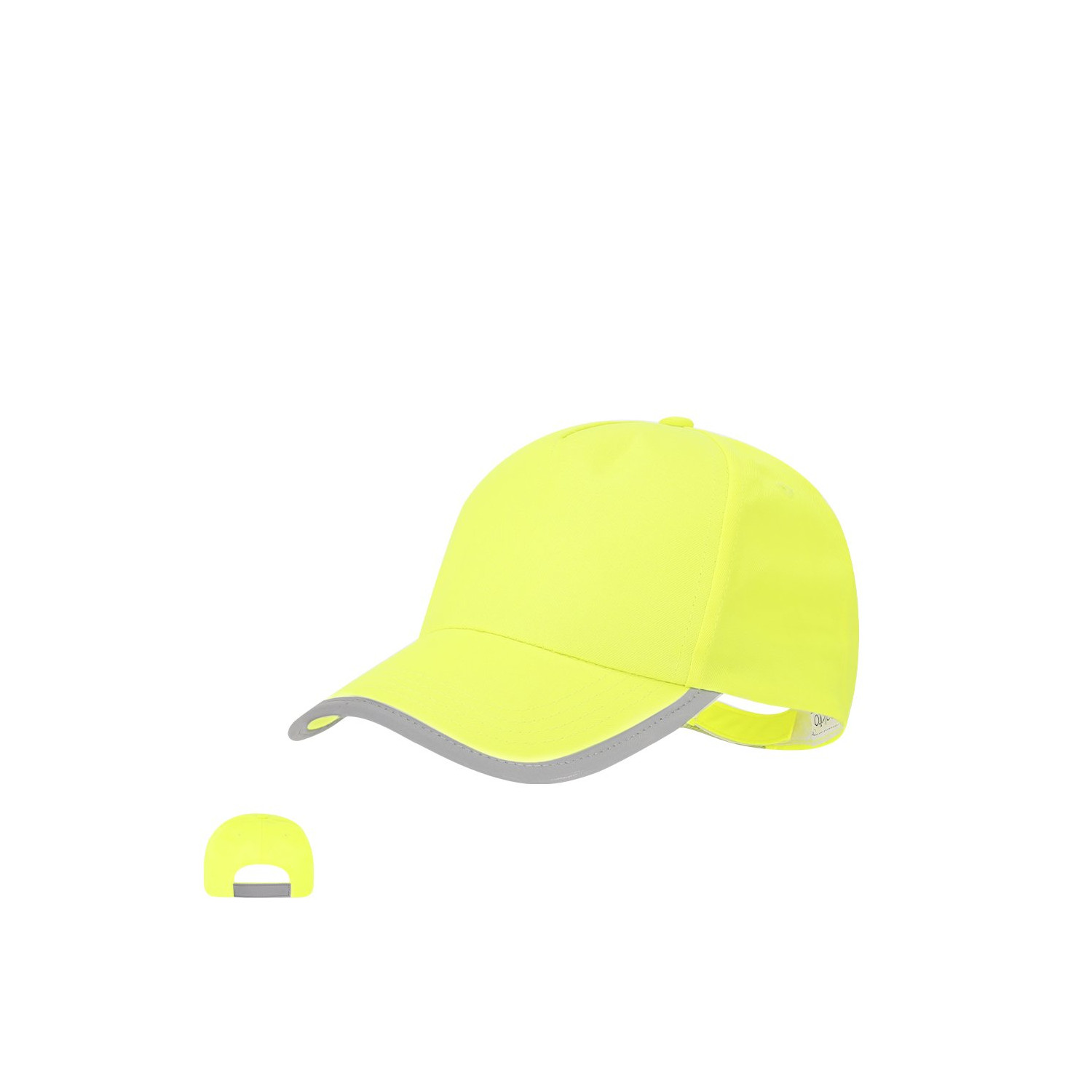 Cappellino sportivo per bambini in morbido poliestere di design bicolore in giallo fluorescente con profilo riflettente sulla visiera e sulla chiusura. Chiusura in velcro e fori di ventilazione ricamati.