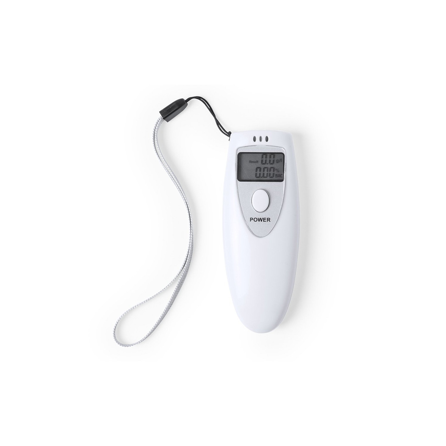 Etilometro tascabile con sistema di misurazione dell'espirazione dell'aria. Con display LCD integrato in finitura liscia bianca, appositamente progettato per la tampografia. Comoda cinghia di trasporto inclusa. Alimentazione a batteria: 2xAAA non incluse e manuale d'uso in inglese e spagnolo. Presentato in una scatola dal design accattivante.