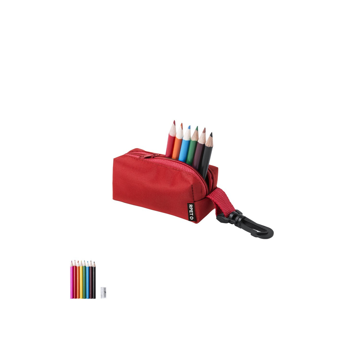 Custodia in poliestere 420D RPET con chiusura a cerniera e pratico gancio moschettone. Distintivo RPET sull'etichetta. Comprende:- 8 matite di legno di diversi colori (nero, rosso, azzurro chiaro, giallo, verde, arancione, rosa e marrone) - temperatore trasparenteIl materiale RPET è realizzato in plastica riciclata, promuovendo così il riutilizzo dei rifiuti di plastica e favorendo la sostenibilità del pianeta.