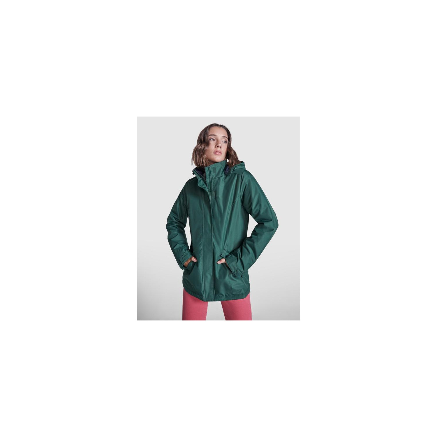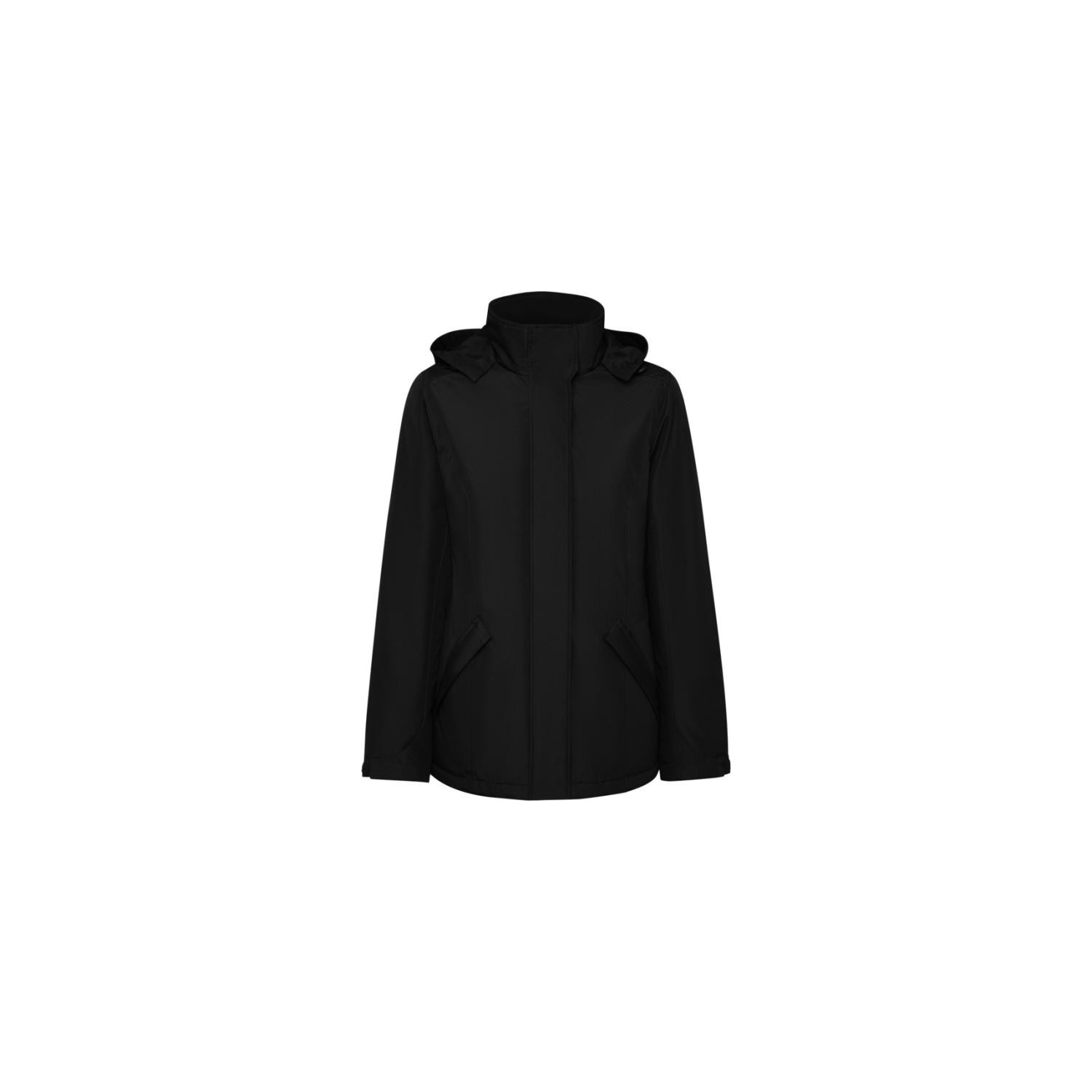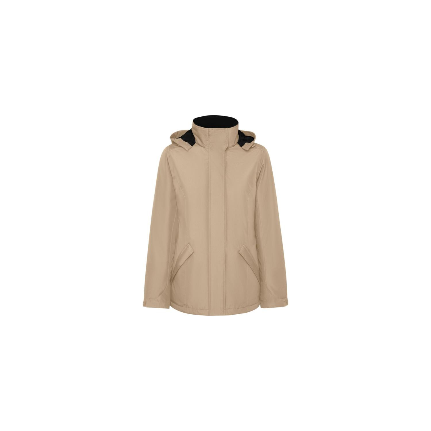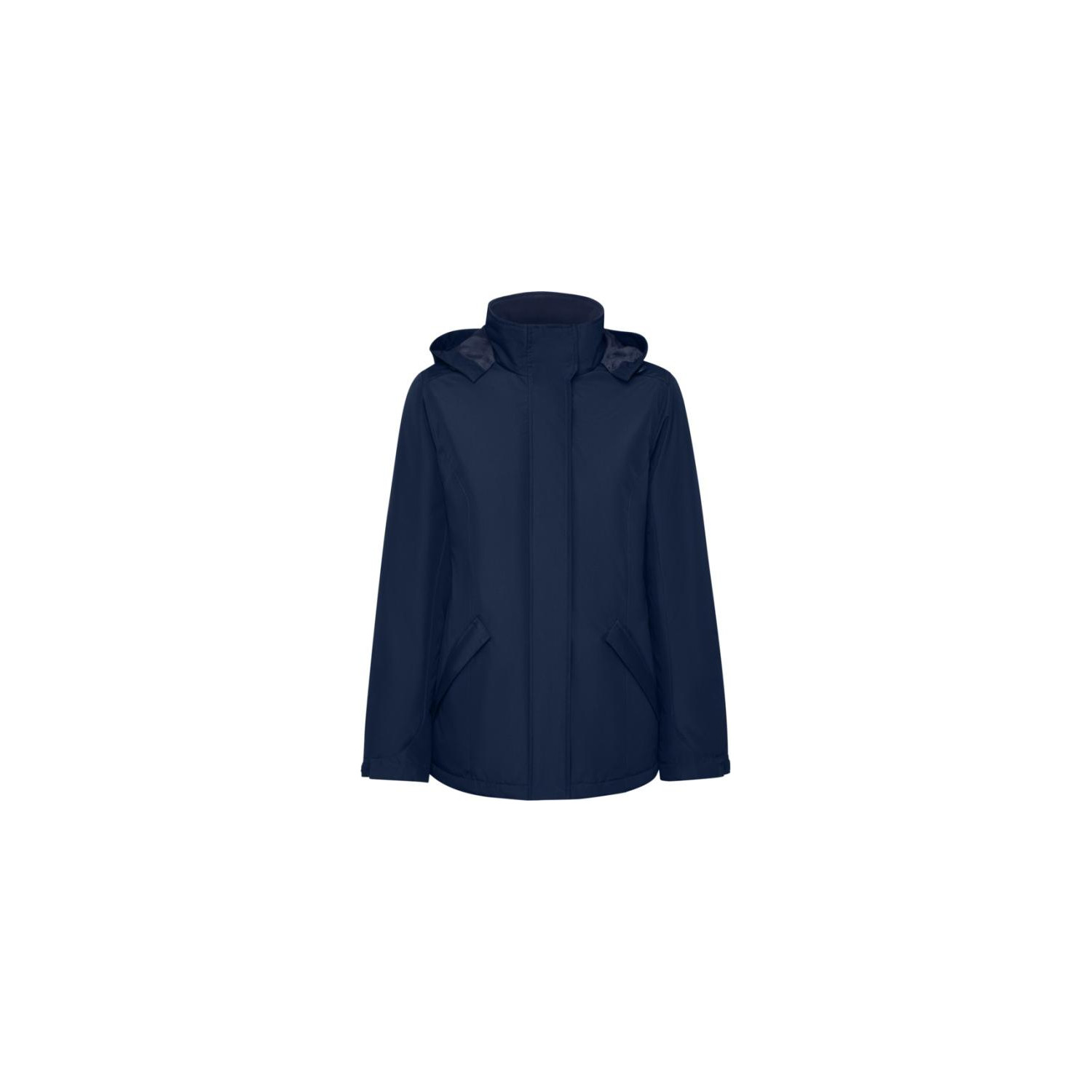 Giacca parka impermeabile imbottita da donna. Aderente. Collo alto con cappuccio ripiegabile e rimovibile con chiusura a strappo. Zip centrale abbinata con pattina. Tasche laterali con zip e pattina fissa. Tasca interna con chiusura a strappo. Polsini regolabili con passante a strappo. Accesso interno per rinforzi sul retro e sul petto a sinistra.