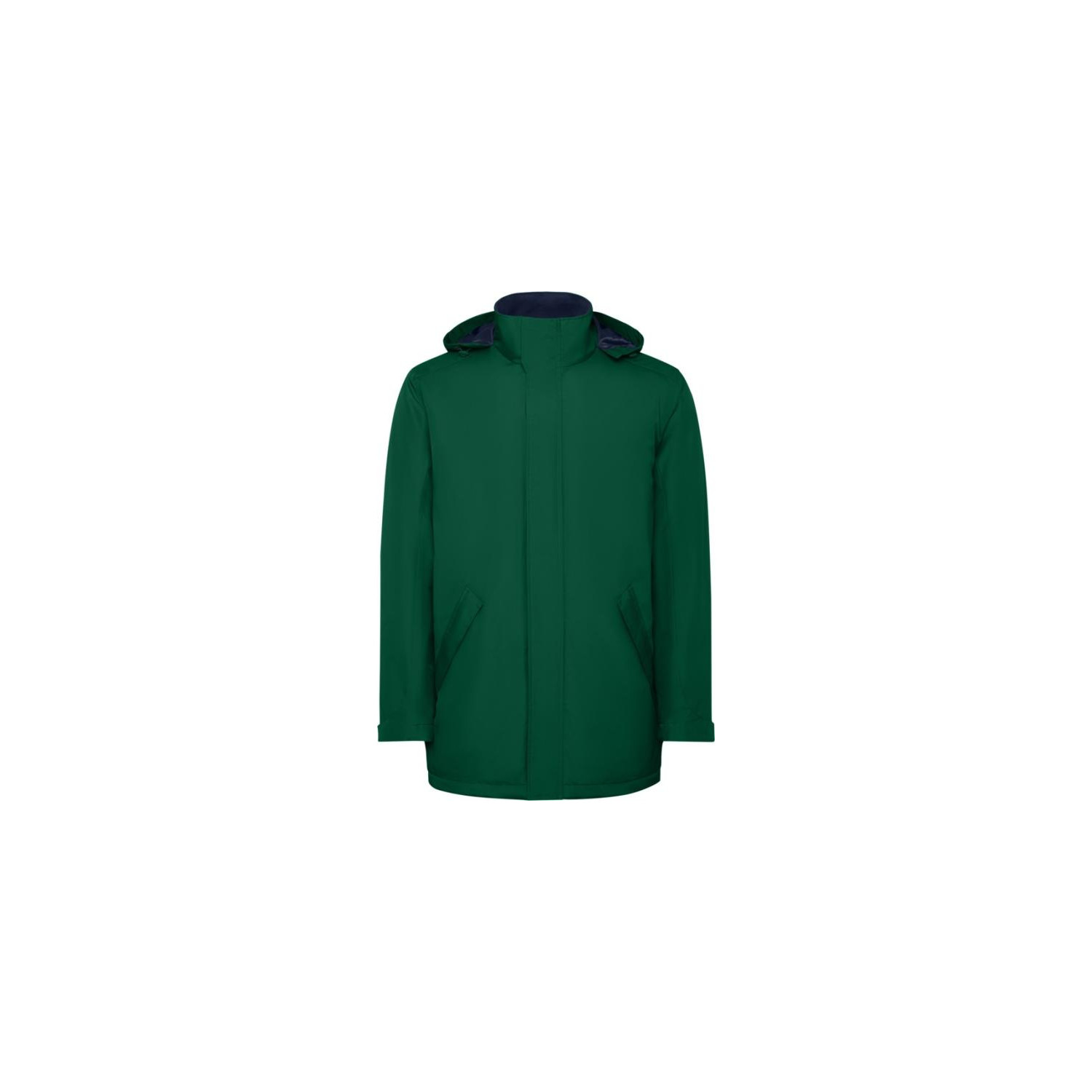 Giacca parka impermeabile imbottita da uomo. Collo alto con cappuccio ripiegabile e rimovibile con chiusura a strappo. Zip centrale abbinata con pattina. Tasche laterali con zip e pattina fissa. Tasca interna con chiusura a strappo. Polsini regolabili con passante a strappo. Accesso interno per rinforzi sul retro e sul petto a sinistra.