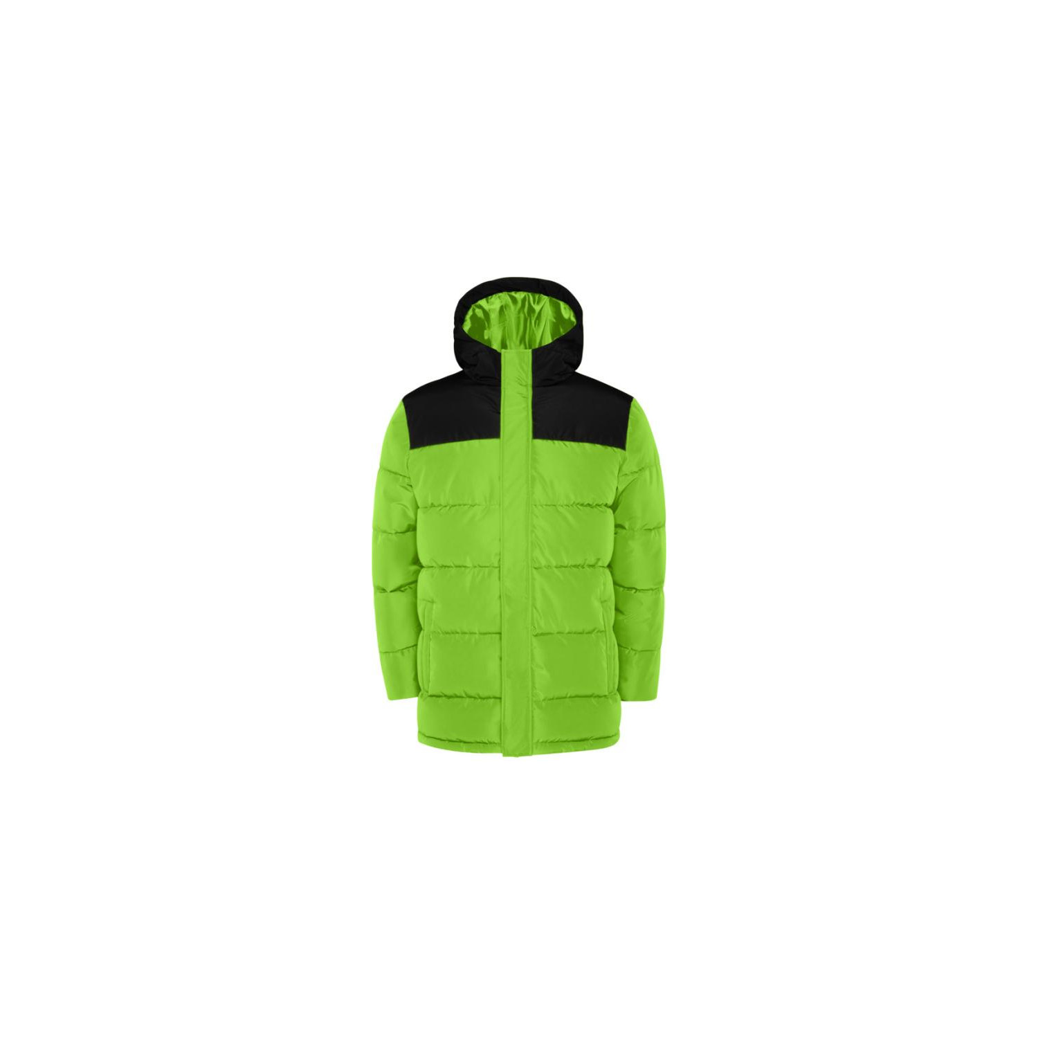 Giacca imbottita con cappuccio fisso. Cerniera anteriore coperta da una pattina. Proteggi mento. Due tasche laterali con zip. Polsini elasticizzati.