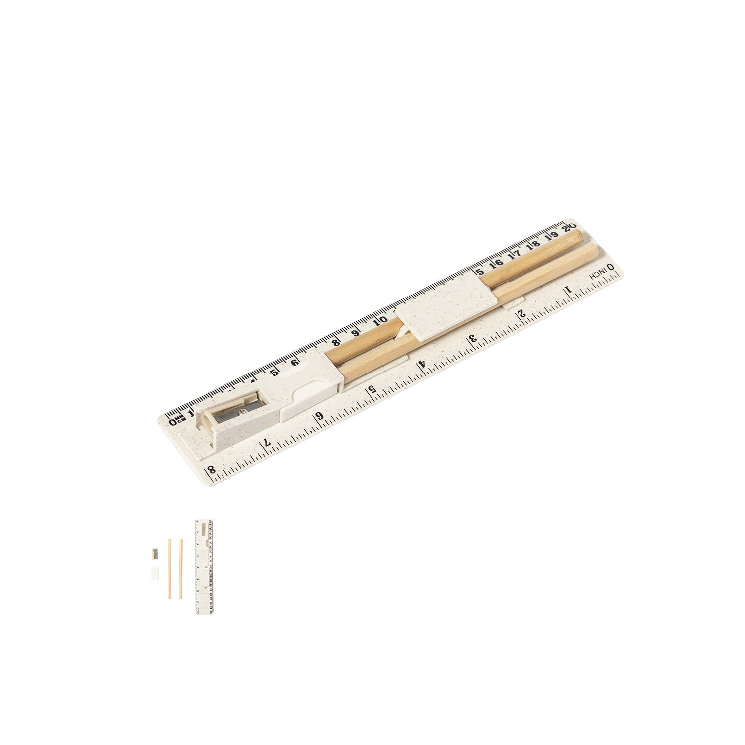 Set di 5 pezzi in fibra di grano. Include 2 matite in legno con mina nera e corpo cilindrico bianco; gomma e temperino. Presentato in un astuccio/righello da 20 cm/8 pollici, con scomparti per i diversi elementi del set. Confezionato singolarmente in un sacchetto di carta bianco. La fibra di grano promuove l'utilizzo di materie prime naturali, riducendo così le emissioni inquinanti.