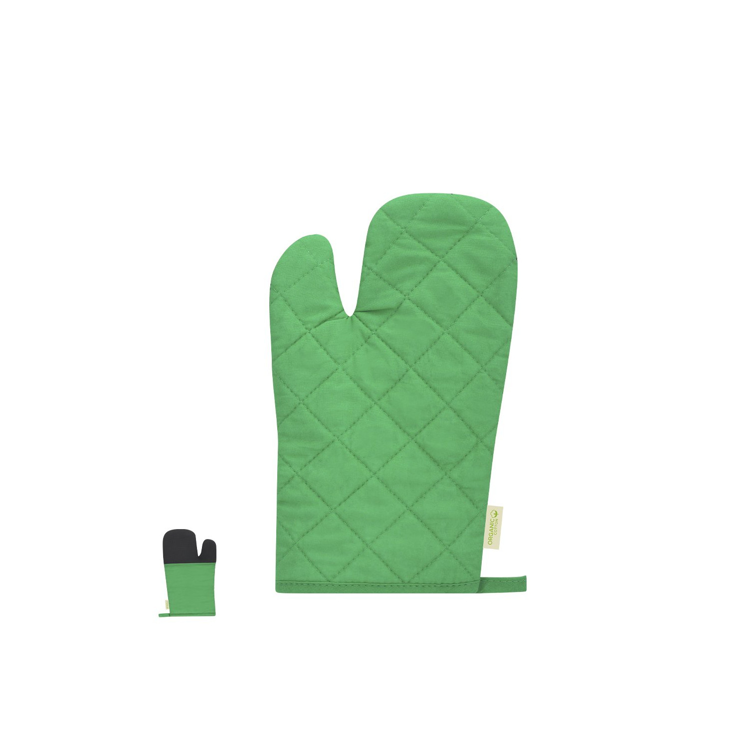 Guanto da cucina in cotone organico con rivestimento in gomma nella zona di presa per maggiore protezione contro le alte temperature. Include etichetta in cotone organico.
