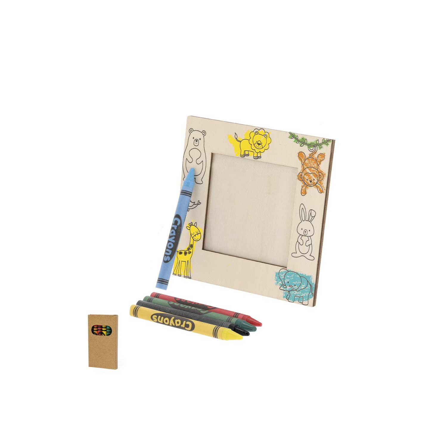 Cornice per foto realizzata in legno naturale con design di animali. Include cere colorate per personalizzare e decorare la cornice. Progettata per fotografie di 7,5x7,5 cm. Dotata di pratico supporto posteriore a cerniera.