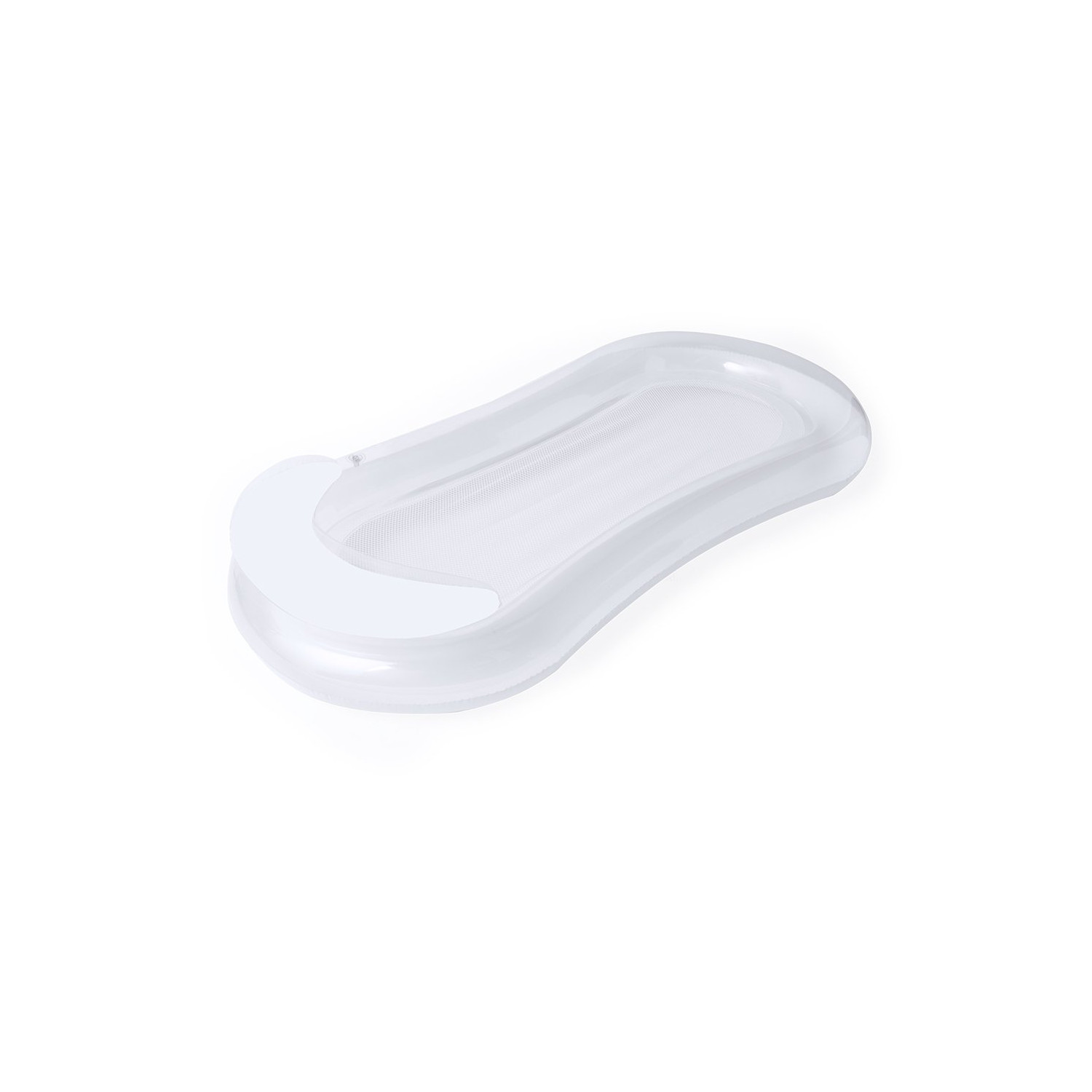 Materassino originale in resistente PVC. Include un comodo cuscino per la testa, dal design bicolore, nei colori trasparente e bianco. Include una resistente rete centrale in poliestere bianco. Con piegatura speciale per una facile stampa. Viene fornito sgonfio e in una pratica busta individuale riciclata.