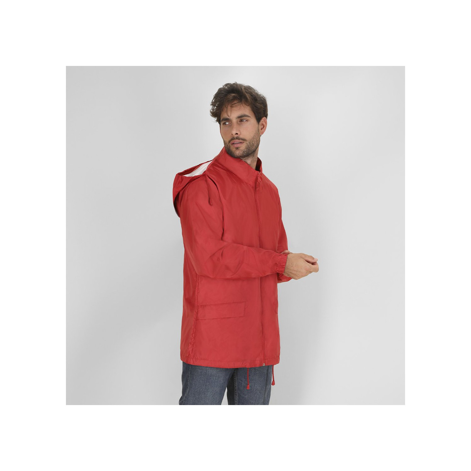 Impermeabile unisex con collo alto e cappuccio removibile.
