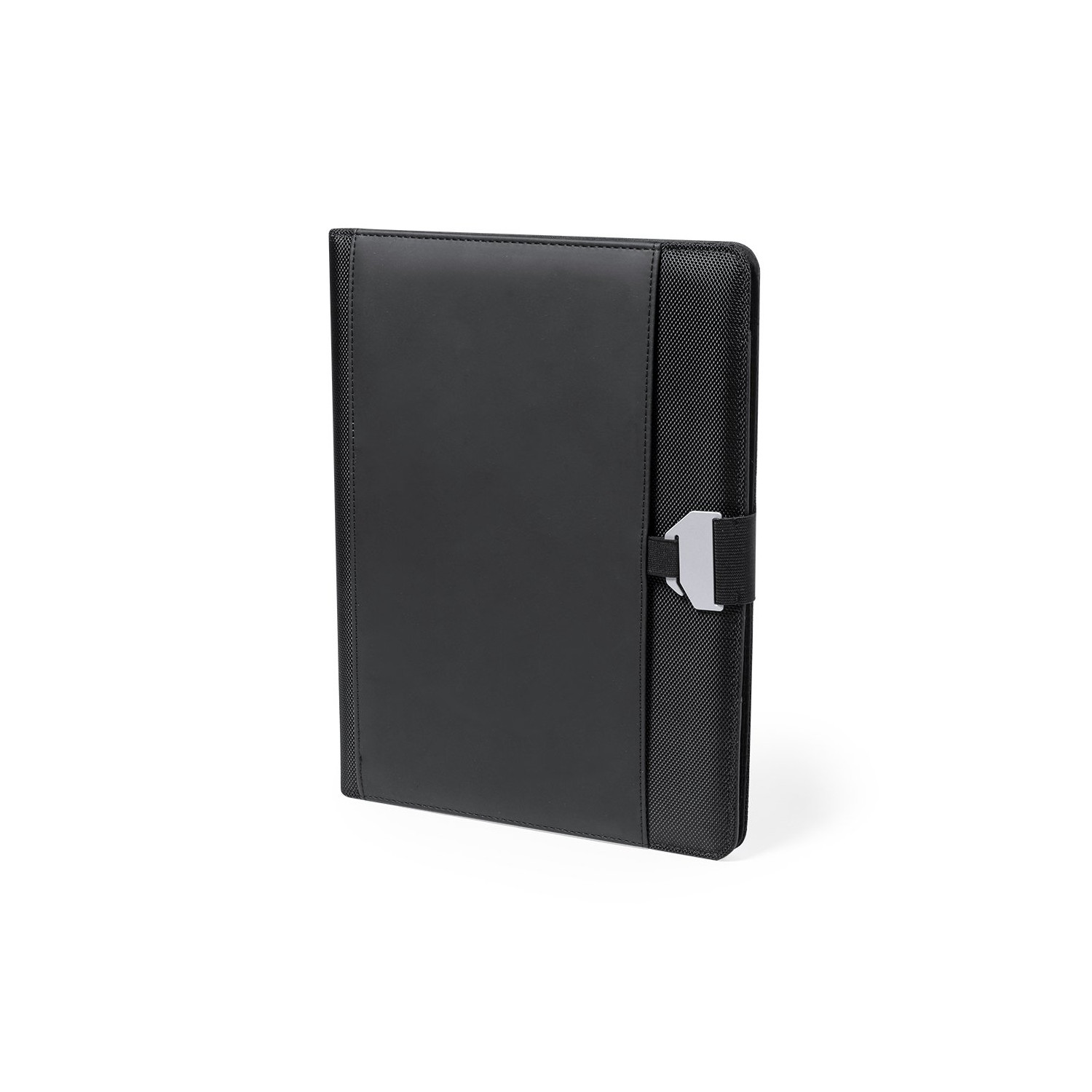 Cartella tecnologica in elegante combinazione di poliestere e morbida similpelle con originale chiusura in metallo. Interno con vari scomparti per riporre chiavetta USB, powerbank, scomparto a sfioramento per smartphone, portacarte e portapenne. Con block notes rimovibile di 20 pagine a righe e presentato in un'elegante scatola nera.