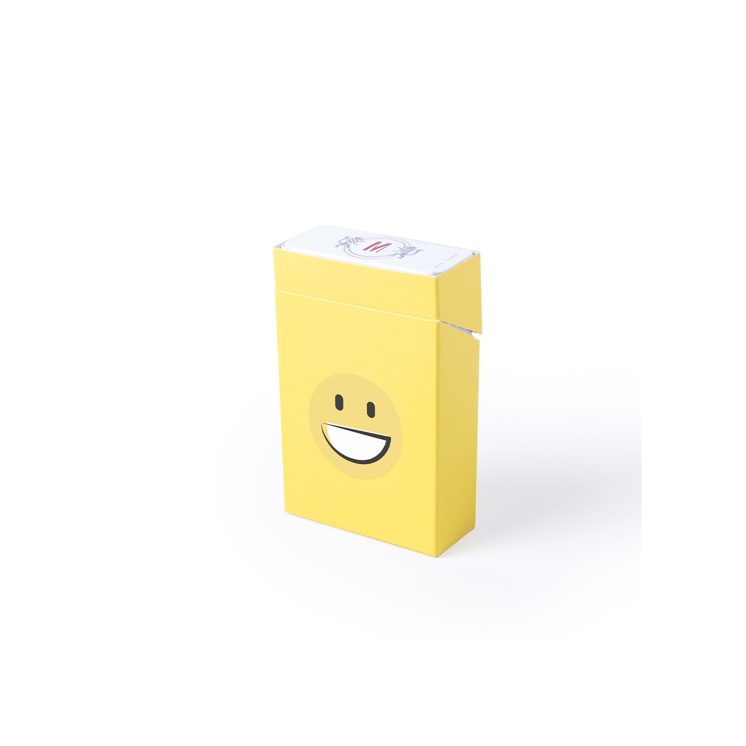 Portasigarette dal divertente design emoji in colore giallo brillante. In cartoncino lucido con emoji sul retro e presentazione ripiegata.