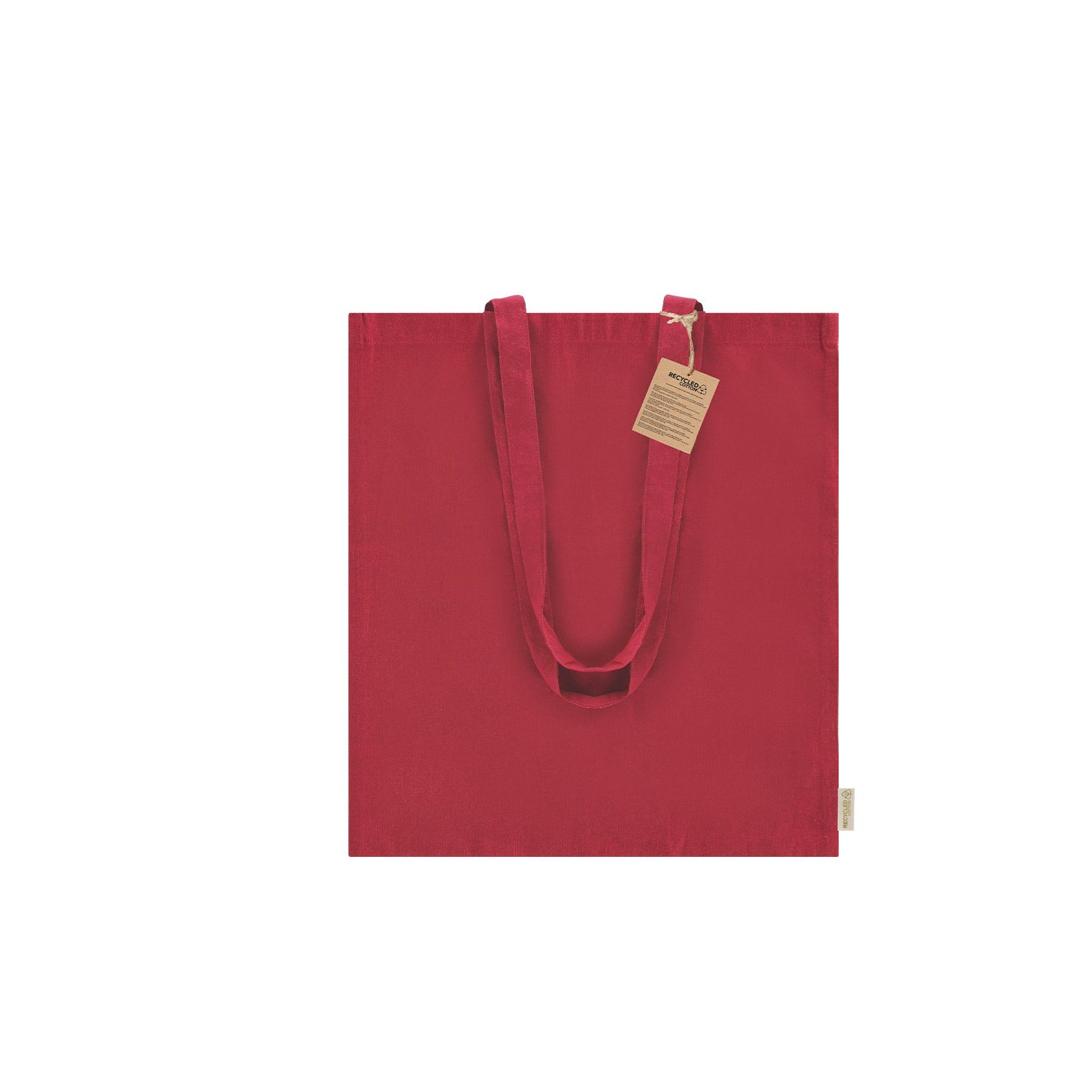 Borsa fatta di cotone riciclato da 140 g/m2 . Manici lunghi da 70 cm con rinforzo, finitura cucita. Logo sull'etichetta laterale e resistenza fino a 6 kg di peso