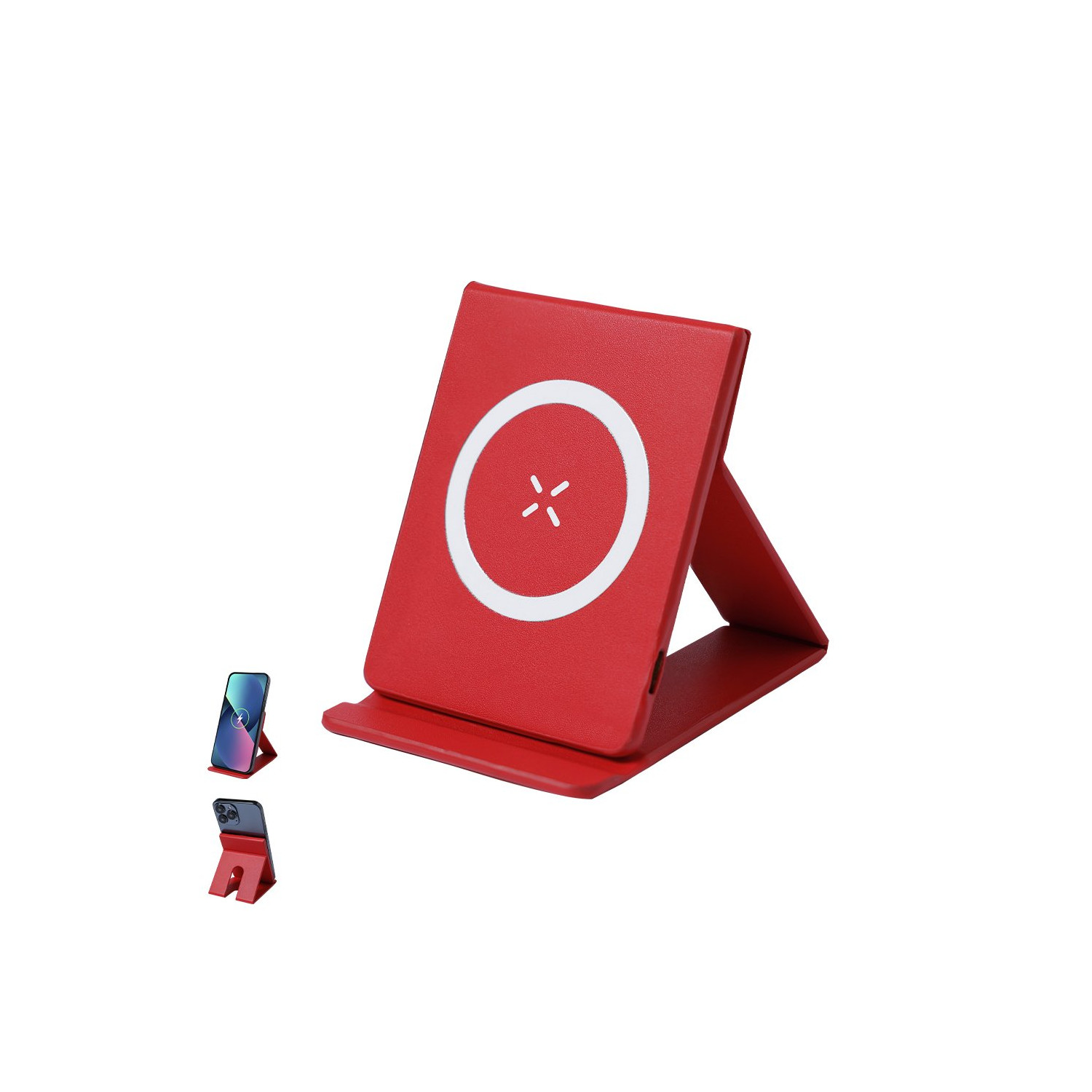 Caricatore wireless magnetico 15W, realizzato in PU. Include supporto pieghevole, con possibilità di diverse posizioni per lo smartphone, e indicatore di stato di carica. Compatibile con terminali dotati di tecnologia di ricarica wireless. Contiene cavo di ricarica USB di 1m, con connettore di ingresso Tipo C, e anello metallico con adesivo. Manuale di istruzioni disponibile in spagnolo e inglese.