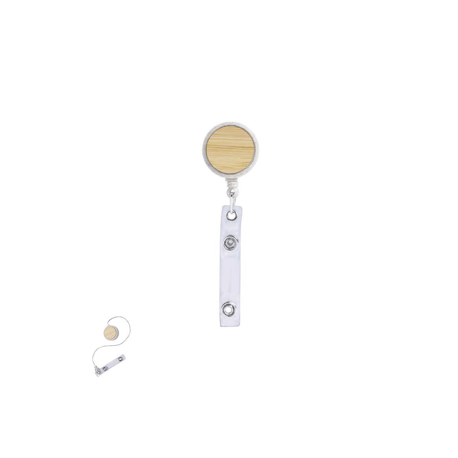 Portabadge estensibile in bambù e fibra di grano. Con cinghia di chiusura a bottone e meccanismo estensibile fino a 70 cm. Include una clip posteriore in metallo per il fissaggio. Con ampia superficie di stampa sulla parte centrale in bambù. Confezionato singolarmente in un sacchetto riciclato. Materiali come il bambù favoriscono l'uso di materie prime naturali, riducendo le emissioni inquinanti. Proviene da una pianta altamente resistente e versatile, con una crescita e una rigenerazione rapida, rappresentando un'ottima alternativa all'uso del legno tradizionale