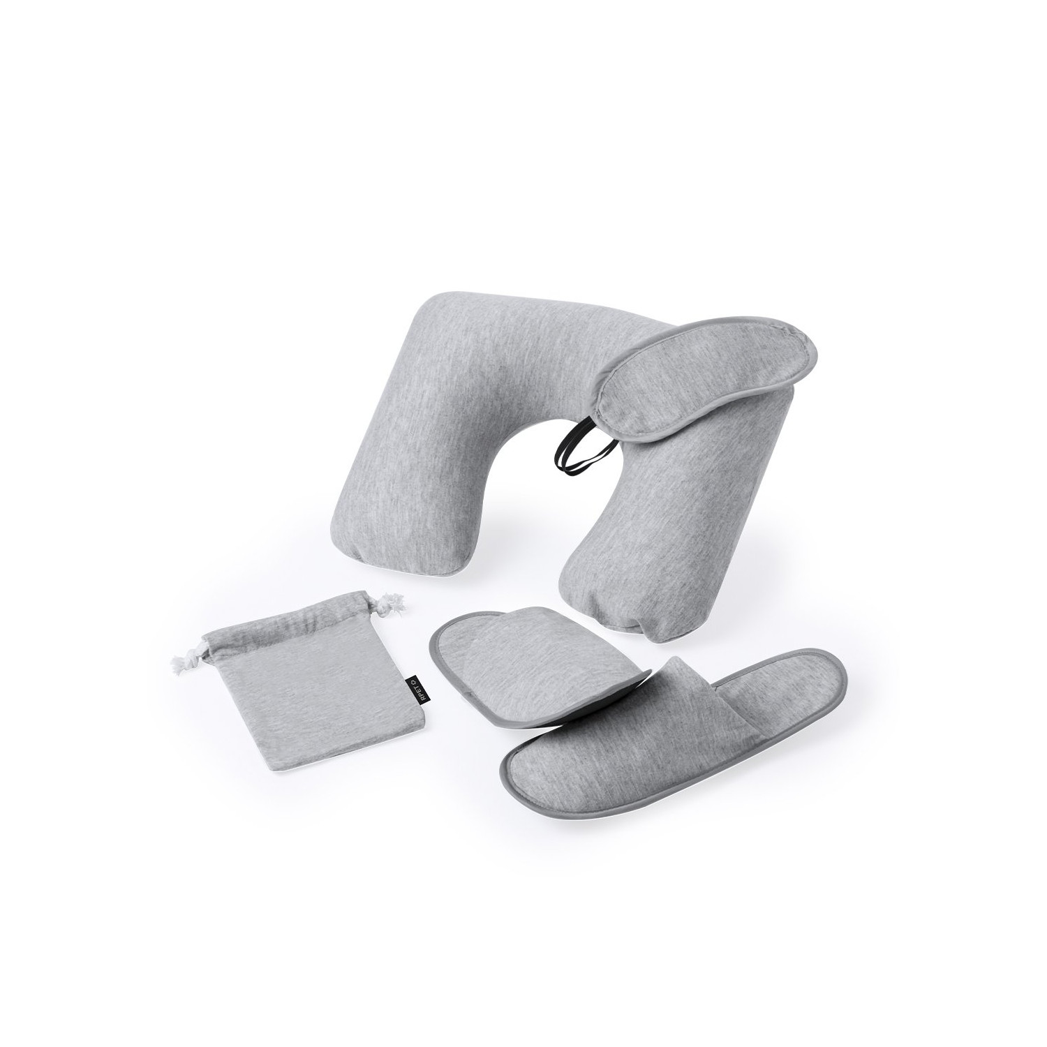 Fantastico set da viaggio in morbido poliestere. Il set comprende: Cuscinetto ergonomico per il collo. Morbida maschera per gli occhi con cinturino regolabile. Pantofole abbinate. Facile da riporre nell'astuccio RPET. Disponibile in colori eleganti, con logo RPET sulla custodia.Il materiale RPET è realizzato con plastica riciclata per incoraggiare il riutilizzo dei rifiuti plastici e contribuire alla sostenibilità del pianeta.