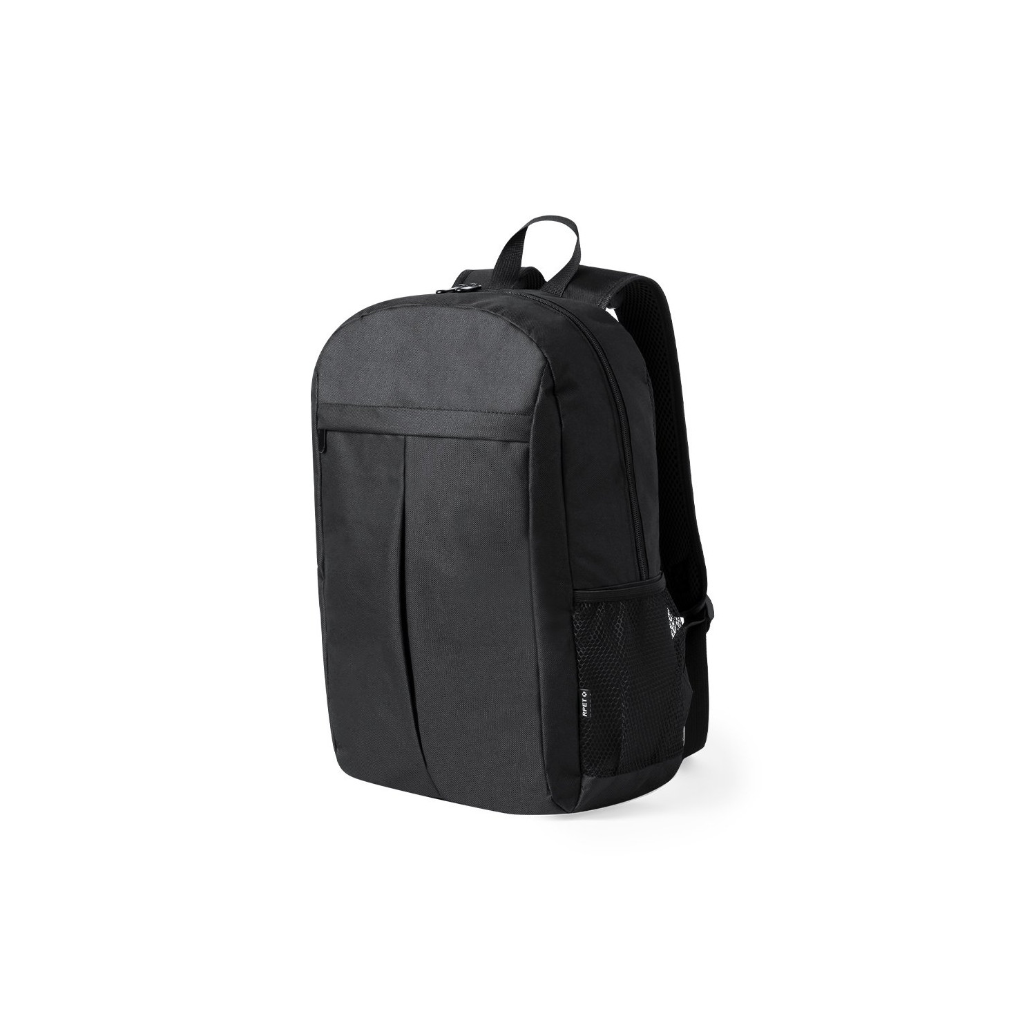 Zaino in resistente RPET 600D. Presenta una chiusura a zip a doppio cursore e una pratica tasca frontale. L'interno dispone di scomparti imbottiti progettati per tablet fino a 10" e laptop fino a 15". Lo schienale e gli spallacci sono imbottiti e regolabili e incorporano uno speciale tessuto traspirante. Dispone anche di una cinghia superiore e di tasche laterali in rete. Marchio RPET sul lato esterno. Confezionato singolarmente in un sacchetto riciclato. Il materiale RPET è realizzato con plastica riciclata per incoraggiare il riutilizzo dei rifiuti plastici e contribuire alla sostenibilità del pianeta