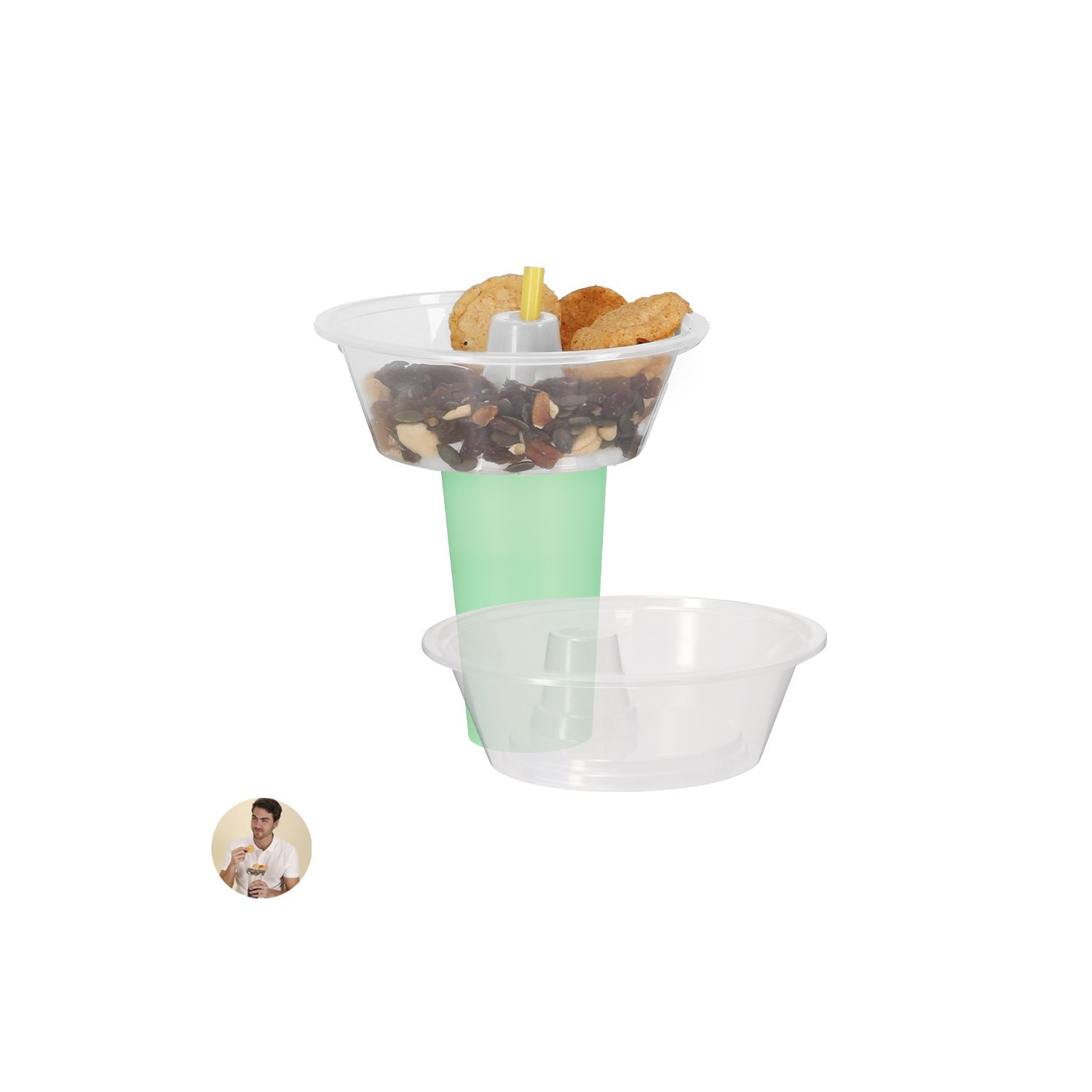 Pratica ciotola realizzata in PP con finitura lucida. Progettata per adattarsi a tutti i tipi di bicchieri e tazze, offrendo una soluzione funzionale e versatile per gustare snack insieme alle tue bevande. Include un'apertura per inserire una cannuccia, consentendo di bere comodamente mentre si gustano gli aperitivi.