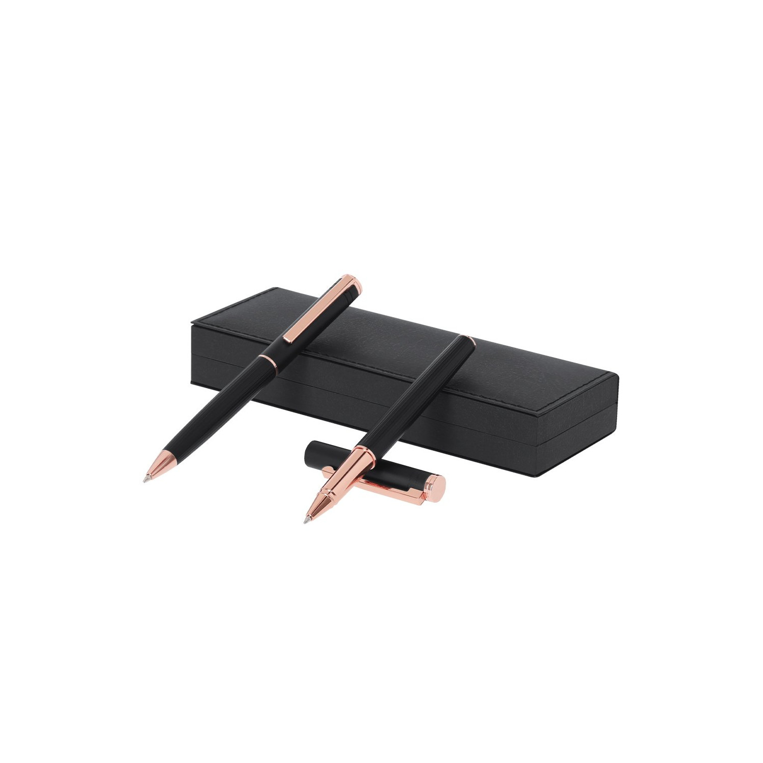 Set di penne distintivo con penna a sfera e roller, entrambe progettate con corpi eleganti in alluminio nero opaco e elementi decorativi in oro rosa. Fusto testurizzato per una presa facile e clip in metallo. Penna a sfera con meccanismo a rotazione e penna roller con cappuccio, entrambe con inchiostro blu e cartuccia jumbo. Presentato in un sofisticato astuccio nero effetto pelle, interno bianco.