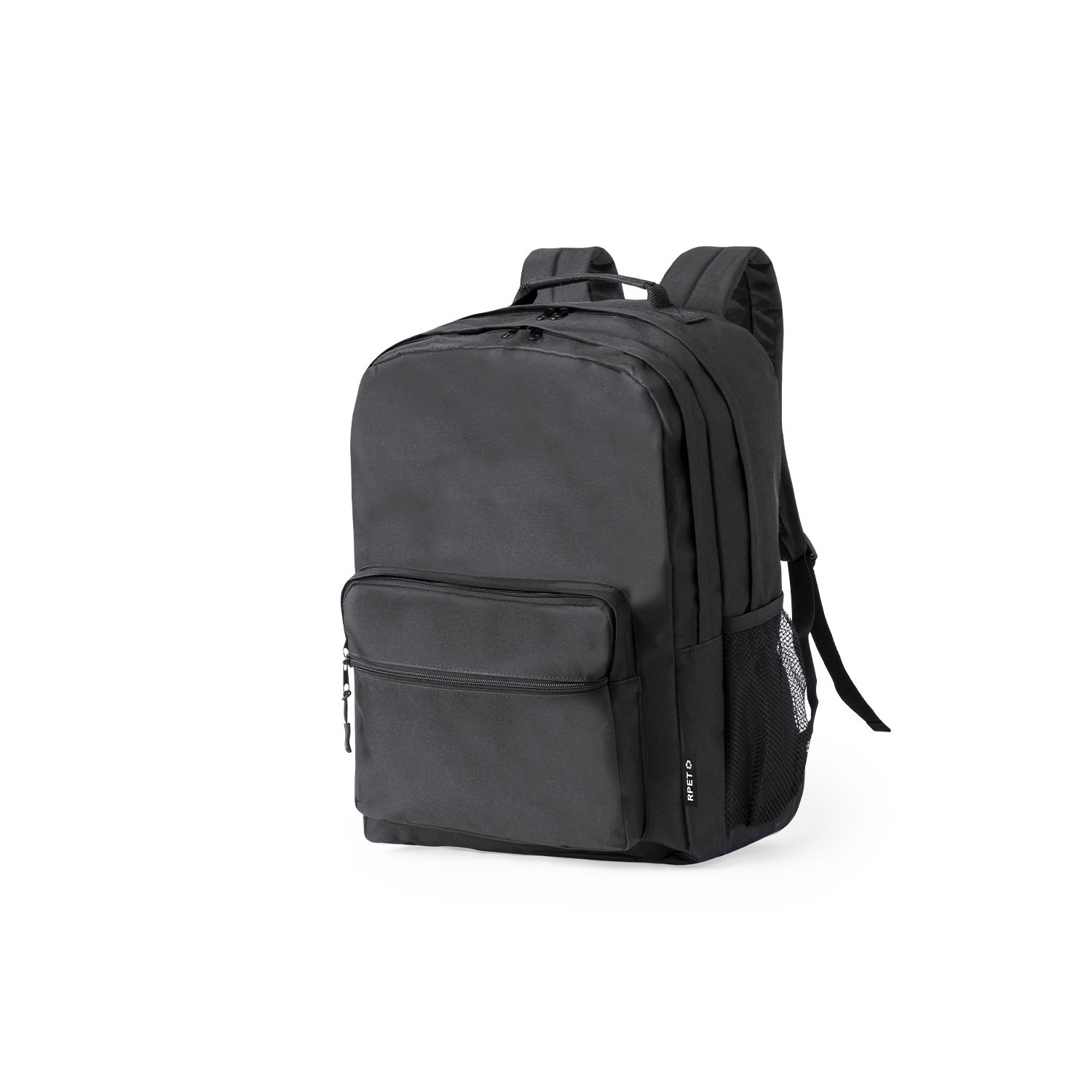Zaino realizzato in resistente RPET 600D. Presenta due tasche centrali con chiusura a zip a doppio cursore e due tasche anteriori per un comodo accesso. All'interno dispone di una tasca imbottita progettata per ospitare un computer portatile fino a 15 pollici. Lo schienale e gli spallacci sono imbottiti e regolabili, con tessuto traspirante. È dotata inoltre di una cinghia superiore e di una tasca laterale in rete. Marchio RPET sul lato esterno. Confezionato singolarmente in un sacchetto riciclato. Il materiale RPET è realizzato con plastica riciclata per incoraggiare il riutilizzo dei rifiuti plastici e contribuire alla sostenibilità del pianeta