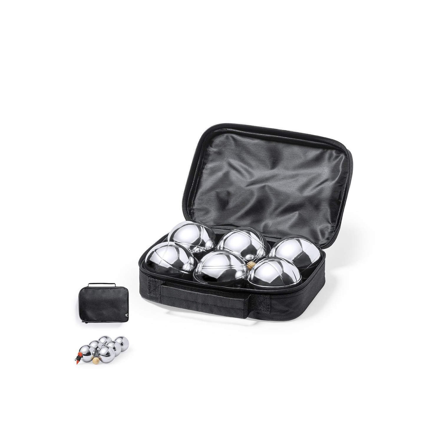 Set gioco delle bocce di alta qualità. Include 6 palle in metallo, una palla da bowling in legno e un cavo di misurazione. Il set è contenuto in una robusta valigetta nera in RPET con maniglia per il trasporto e chiusura a zip in tinta. Etichetta con logo RPET all'esterno.Il materiale RPET è realizzato con plastica riciclata, promuovendo così il riutilizzo dei rifiuti plastici e contribuendo alla sostenibilità del pianeta.