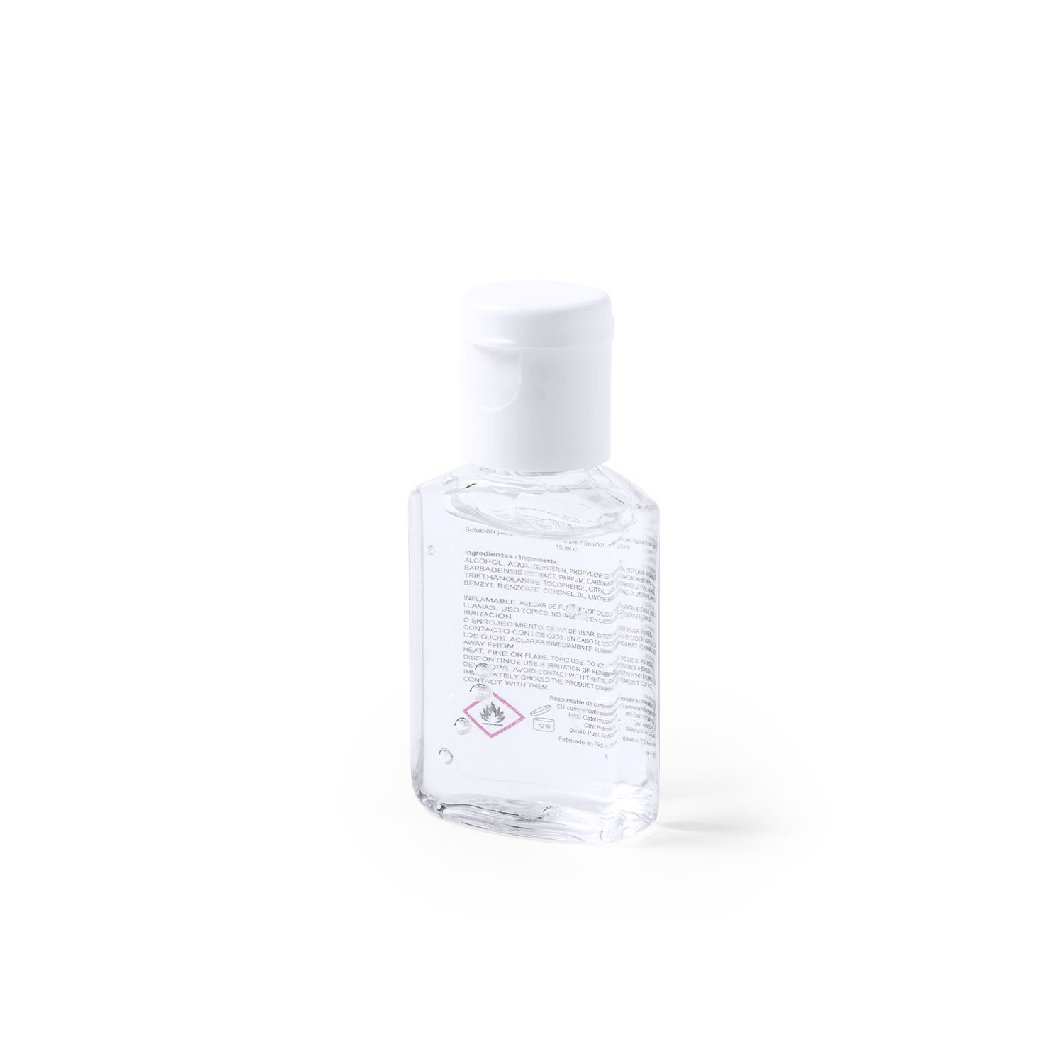 Soluzione detergente per la pelle in un flacone da 15 ml, con dispenser e chiusura di sicurezza. Corpo in colore trasparente, con tappo bianco.
