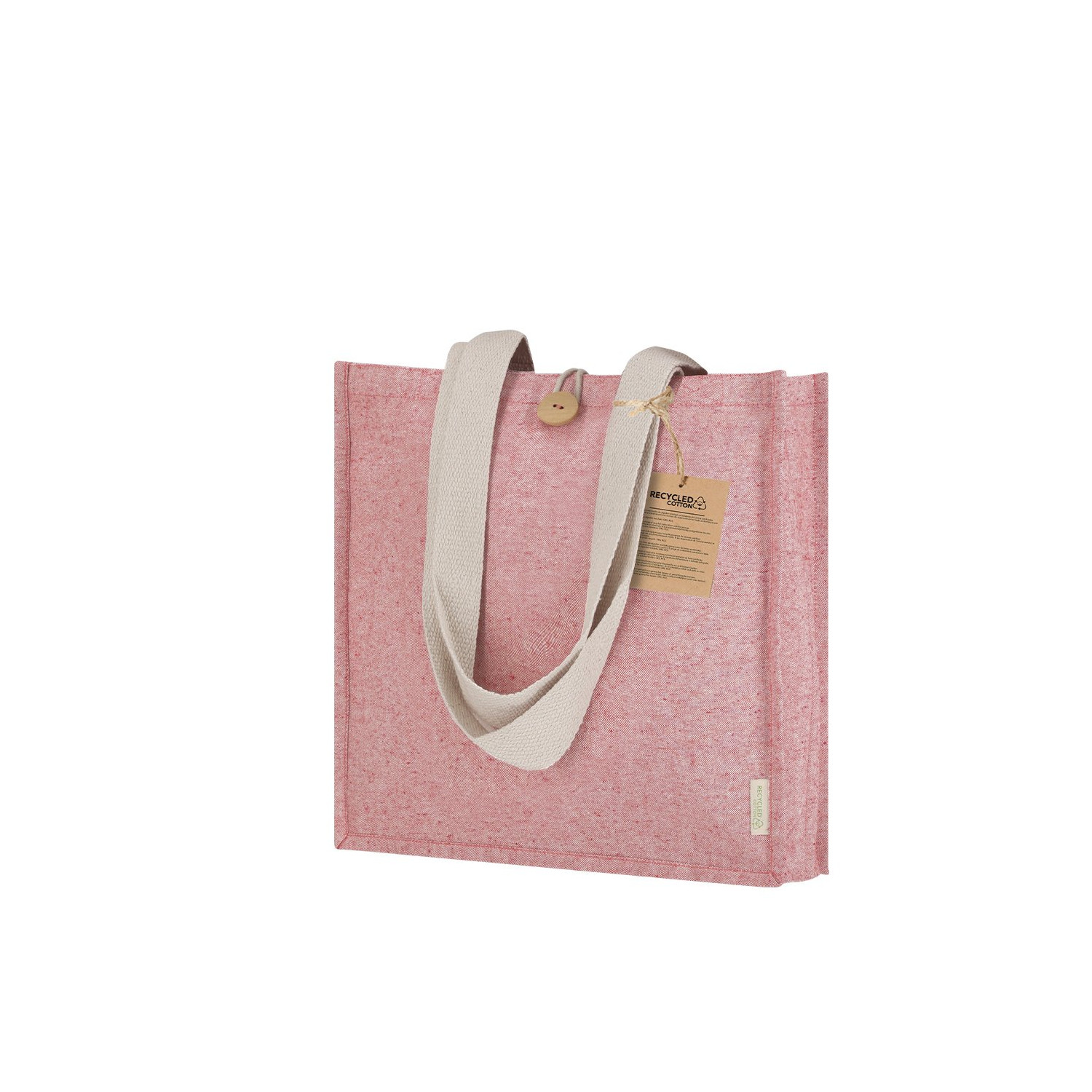 Borsa con fondo e lati a soffietto, realizzata principalmente in cotone riciclato 300 g/m². Dotata di manici lunghi (70 x 3,5 cm) e chiusura superiore con bottone in legno. Include logo Cotone Riciclato. Resistente fino a 10 kg.