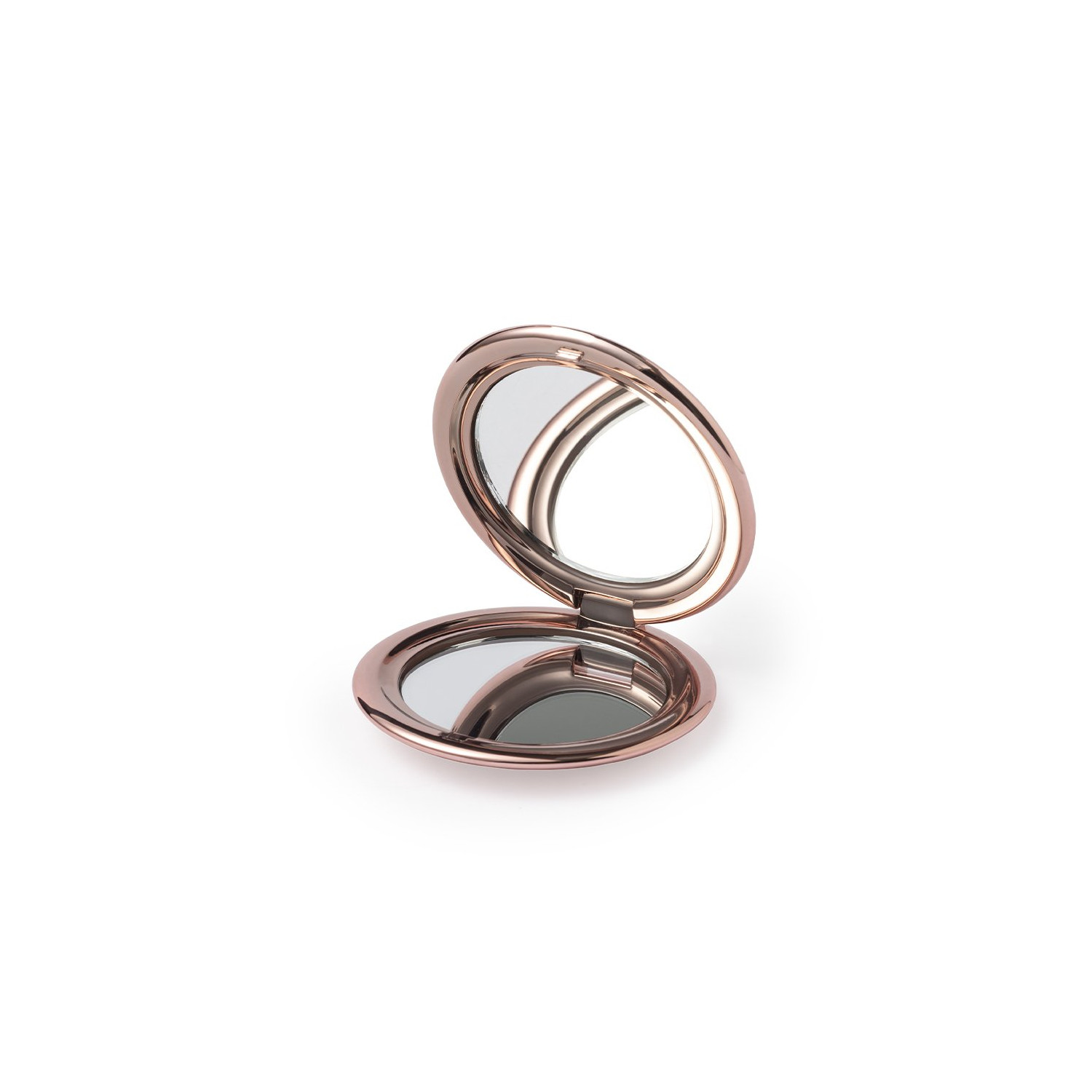 Specchio pieghevole con elegante finitura metallica. Con due specchi interni (ingrandimento 1X e 2X), disponibili in oro, argento e oro rosa.