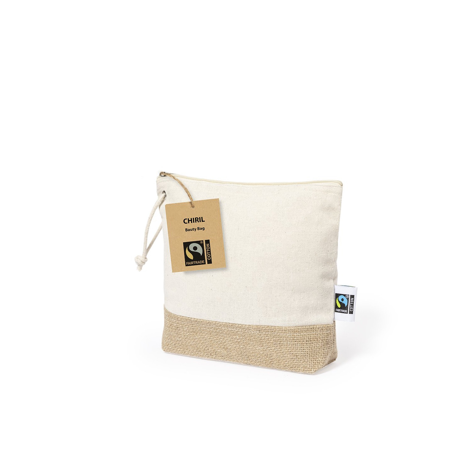 Beauty Case della linea natura, realizzato in cotone e juta laminata. Certificata Fairtrade, un sistema di commercio solidale e alternativo al commercio convenzionale che persegue lo sviluppo dei popoli e la lotta alla povertà. Scomparto principale con chiusura a zip e tiretto in metallo, con base in juta naturale e parte anteriore superiore disponibile in cotone naturale. Con pratica coulisse in un angolo per facilitare il trasporto. Etichetta Fairtrade e targhetta con logo su cartone riciclato incluse.