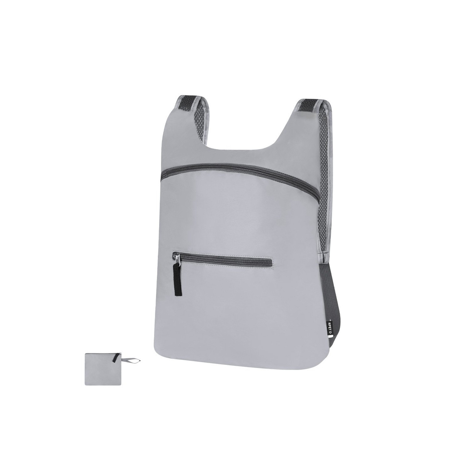 Zaino pieghevole in RPET. Realizzato con tessuto altamente riflettente, grazie a milioni di pigmenti riflettenti basato sul principio della retro-riflessione della luce, una proprietà di visibilità notturna che consiste nella rifrazione della luce verso la fonte di origine. Con chiusura a zip e tasca frontale. Cinghie per spalle regolabili in materiale traspirante. Piegato di piccole dimensioni, con nastro da trasporto. Include distintivo RPET.Il materiale RPET è realizzato a partire da plastica riciclata, per promuovere il riutilizzo dei rifiuti plastici e aiutare la sostenibilità del pianeta.