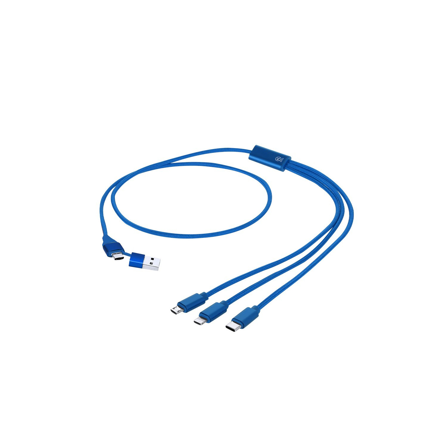 Cavo caricatore in Alluminio Riciclato. Con connessione di ingresso duale di tipo C/USB e uscite di tipo C, Lightning e Micro USB. Include distintivo di Alluminio Riciclato.L'alluminio riciclato è un materiale con possibilità di riciclaggio quasi infinite, senza perdere le sue proprietà originali e consumando meno energia in questo processo.Certificazione GRS (Global Recycled Standard / Standard di Riciclaggio Globale), che garantisce l'origine riciclata del materiale usato per fabbricare il prodotto.Connessione Micro USB, di tipo C e Lightning 5V CC 2.4A
