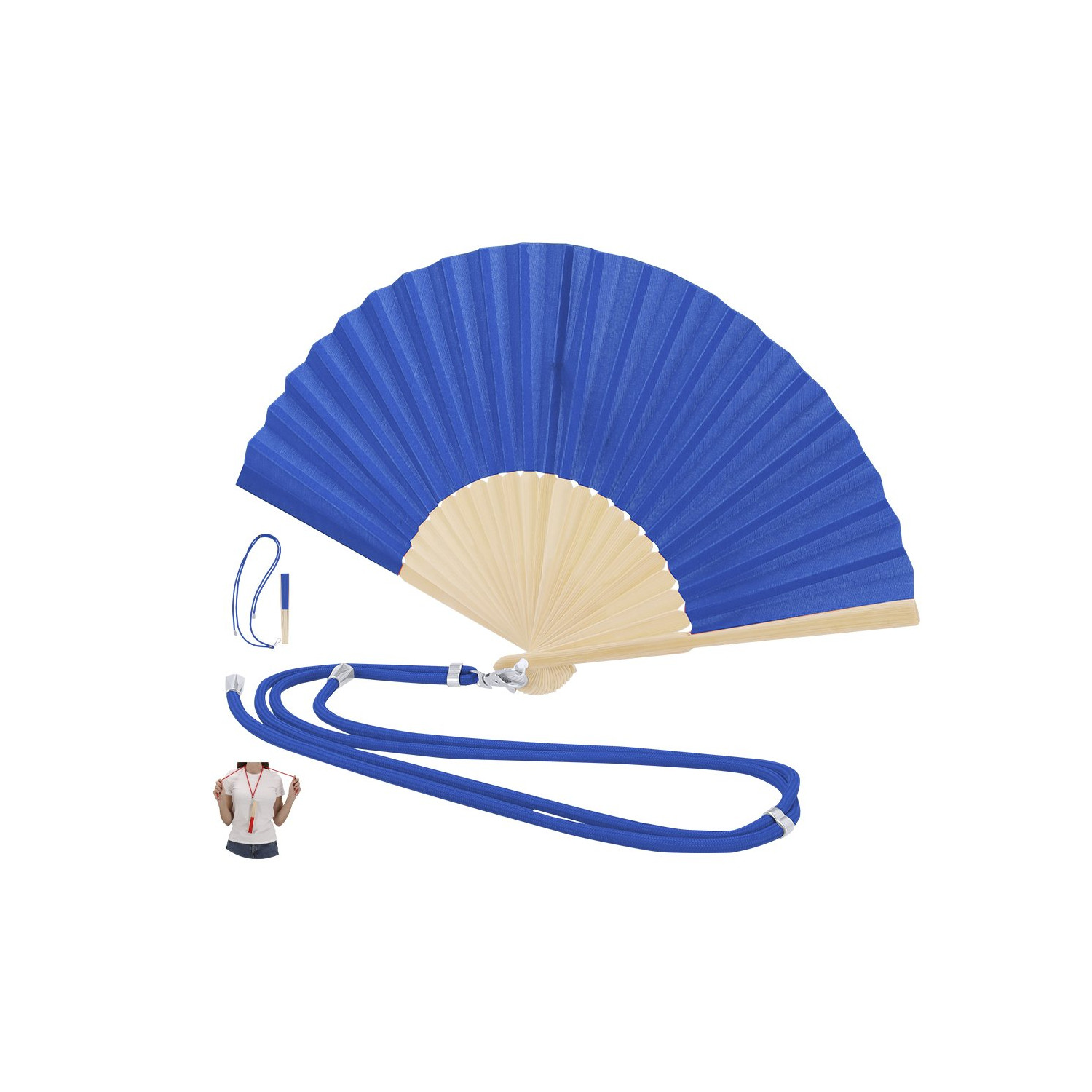 Ventaglio realizzato con tessuto di poliestere resistente e bacchette di bambù flessibili. Include un cordone regolabile per abbinarsi al tessuto e un pratico moschettone in metallo per un facile trasporto.