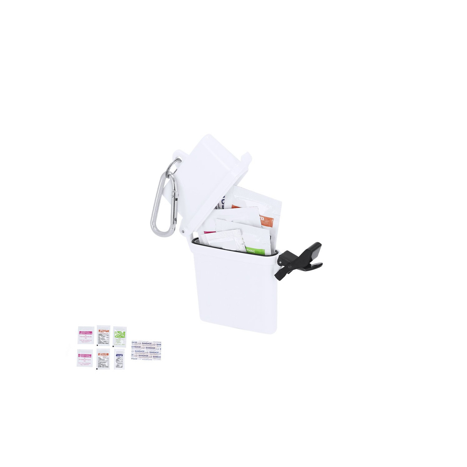 Kit escursionistico di 8 accessori presentato in un astuccio in ABS resistente con pratico moschettone metallico per un comodo trasporto. Include asciugamano per la pulizia delle mani salviettina lenitiva protezione solare SPF30 after sun gel igienizzante e bendaggi.