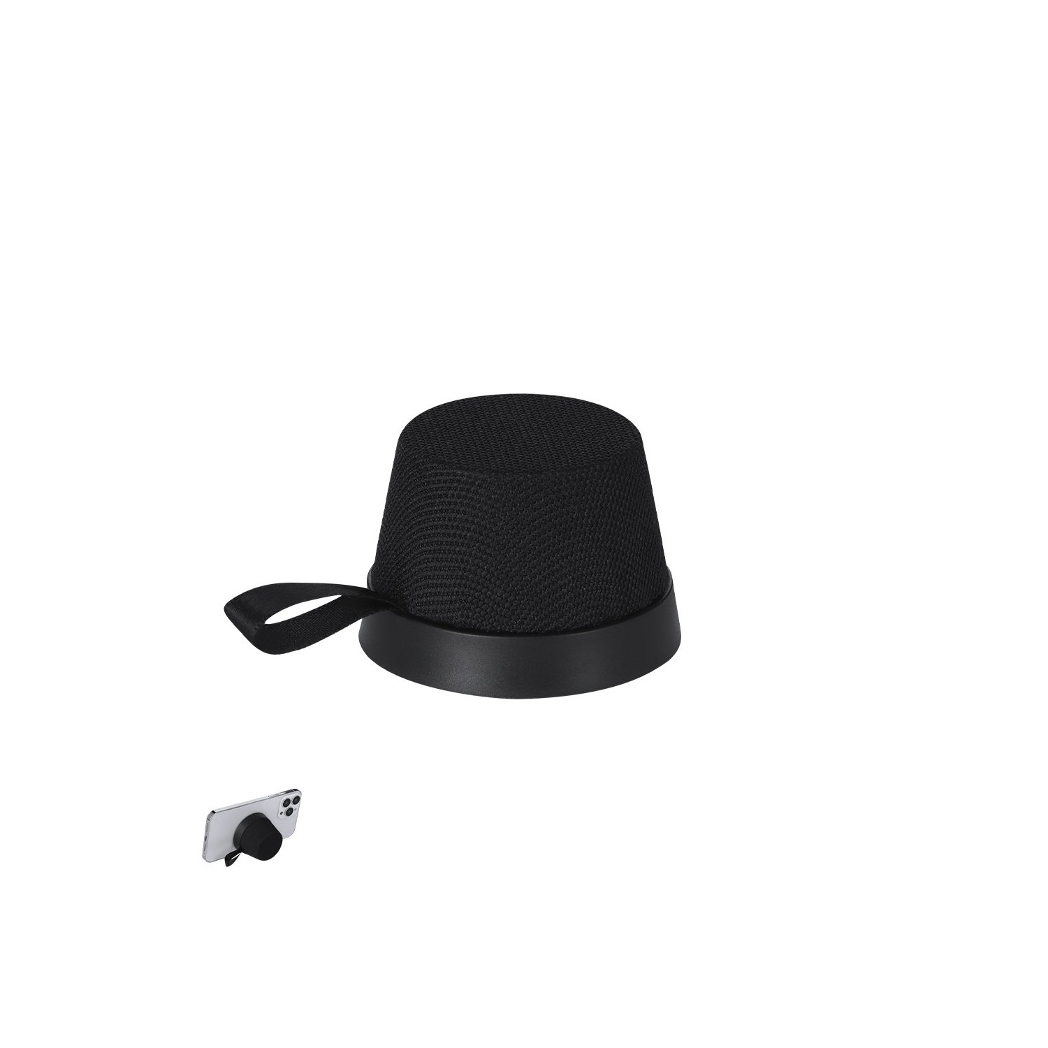 Altoparlante Bluetooth® 3W con gancio magnetico in poliestere RPET. Portamagnetico da mettere sul retro dello smartphone. Include manico in poliestere per un facile trasporto. Connessione Bluetooth 5.3, cavo di ricarica tipo C.
