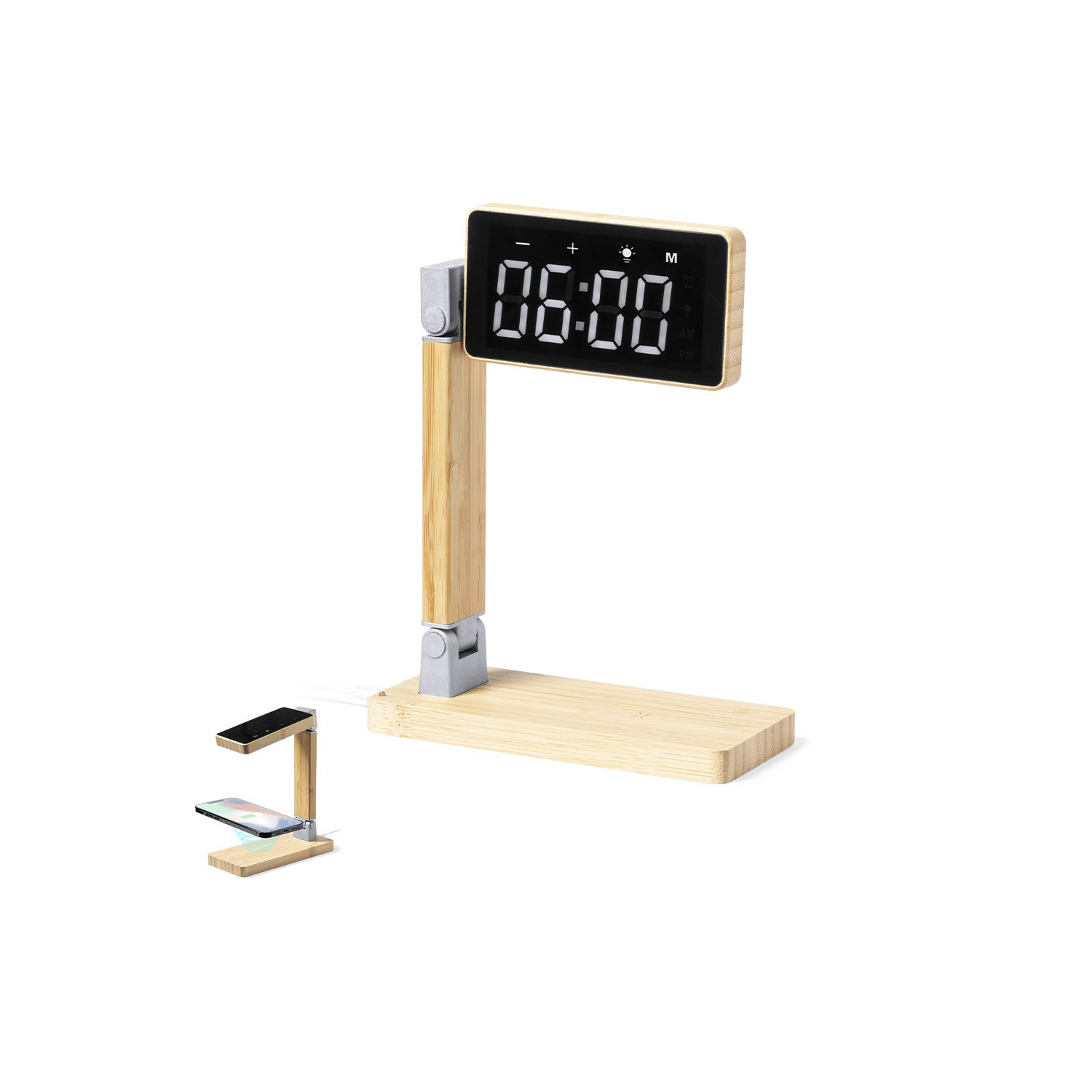 Orologio multifunzione con touch screen retroilluminato e caricatore wireless integrato da 15W con uscita USB (5V DC 2A). Pieghevole e realizzato in bambù, con funzioni di data/ora e sveglia. Lampada con 16 LED e 3 posizioni di illuminazione, con intensità luminosa regolabile. Cavo di ricarica di tipo C incluso e compatibile con i dispositivi dotati di tecnologia di ricarica wireless Qi. Confezionato singolarmente in una scatola kraft di design, con manuale di istruzioni in inglese e spagnolo.Prodotto secondo gli standard RoHS e in conformità ai seguenti requisiti di sicurezza:Sistema di protezione dal surriscaldamento.Sistema di protezione da sovraccarico.Sistema di bloccaggio per evitare cortocircuiti.