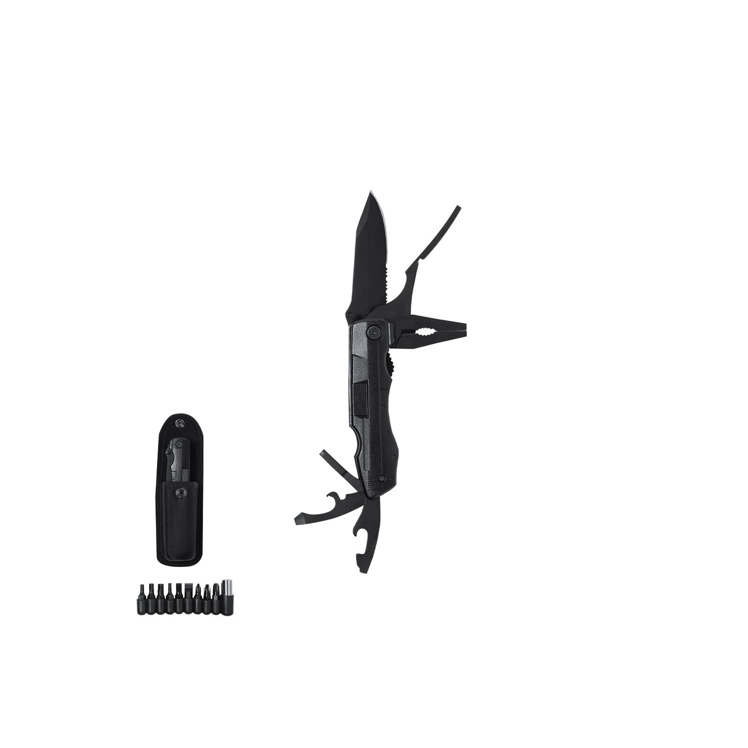 Coltello multiuso con finitura nera in acciaio inox e resistente impugnatura coordinata in alluminio. Design pieghevole e dimensioni compatte. Include 10 funzioni: - Cacciavite con punte multiple- Coltello a lama liscia e seghettata-Apribottiglie-Apriscatole-Pinze con tagliafiliPresentato in un pratico astuccio in poliestere coordinato con accessorio per cintura.