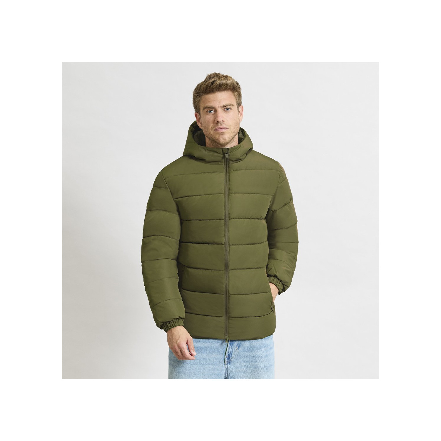 Parka imbottito unisex con cappuccio fisso e visiera integrata. Dotato di chiusura frontale con zip tono su tono a doppio cursore e protezione per il mento, polsini elastici per una vestibilità confortevole e due tasche laterali con chiusura a zip coordinata. Include accesso interno per marcatura su petto sinistro e schiena, ideale per la personalizzazione.