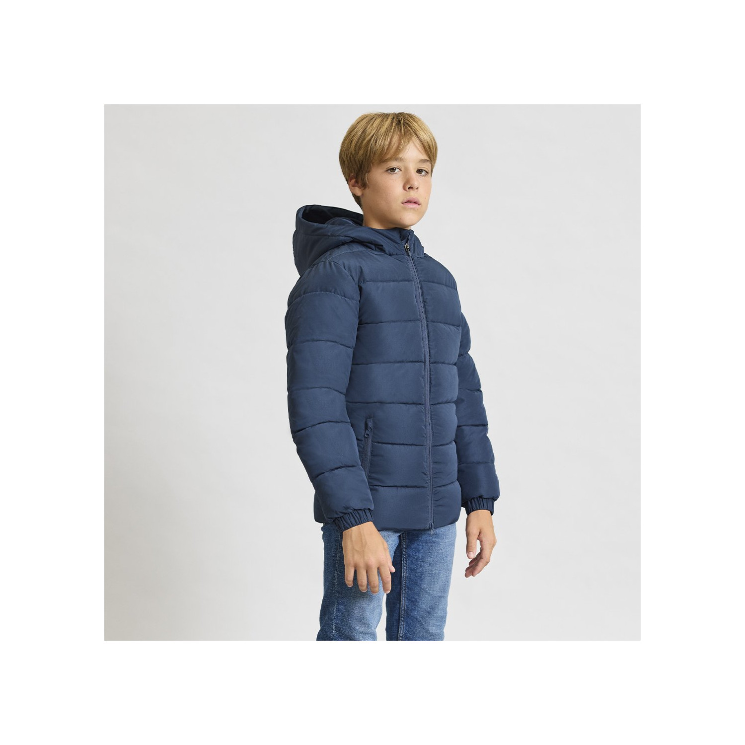 Parka imbottito unisex per bambini con cappuccio fisso e visiera integrata. Dotato di chiusura frontale con zip tono su tono a doppio cursore e protezione per il mento, polsini elastici per una vestibilità confortevole e due tasche laterali con chiusura a zip coordinata. Include accesso interno per marcatura su petto sinistro e schiena, ideale per la personalizzazione.