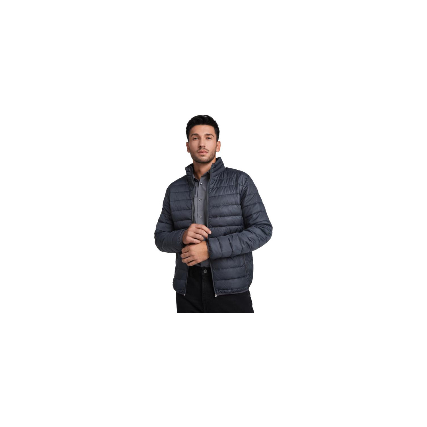 Giubbotto da uomo trapuntato con imbottitura morbida al tatto. Cerniere invertite con protezione per il mento e tiretto abbinato. Due tasche anteriori con cerniera. Finiture elastiche abbinate sul colletto, sui polsini e sull’orlo. Fodera interna a contrasto. Include una borsa per riporlo durante il trasporto. Indumento leggero e pieghevole. Etichetta rimovibile. Idrorepellente. Anti*vento. Il modello è alto 184 cm ed indossa una taglia L.