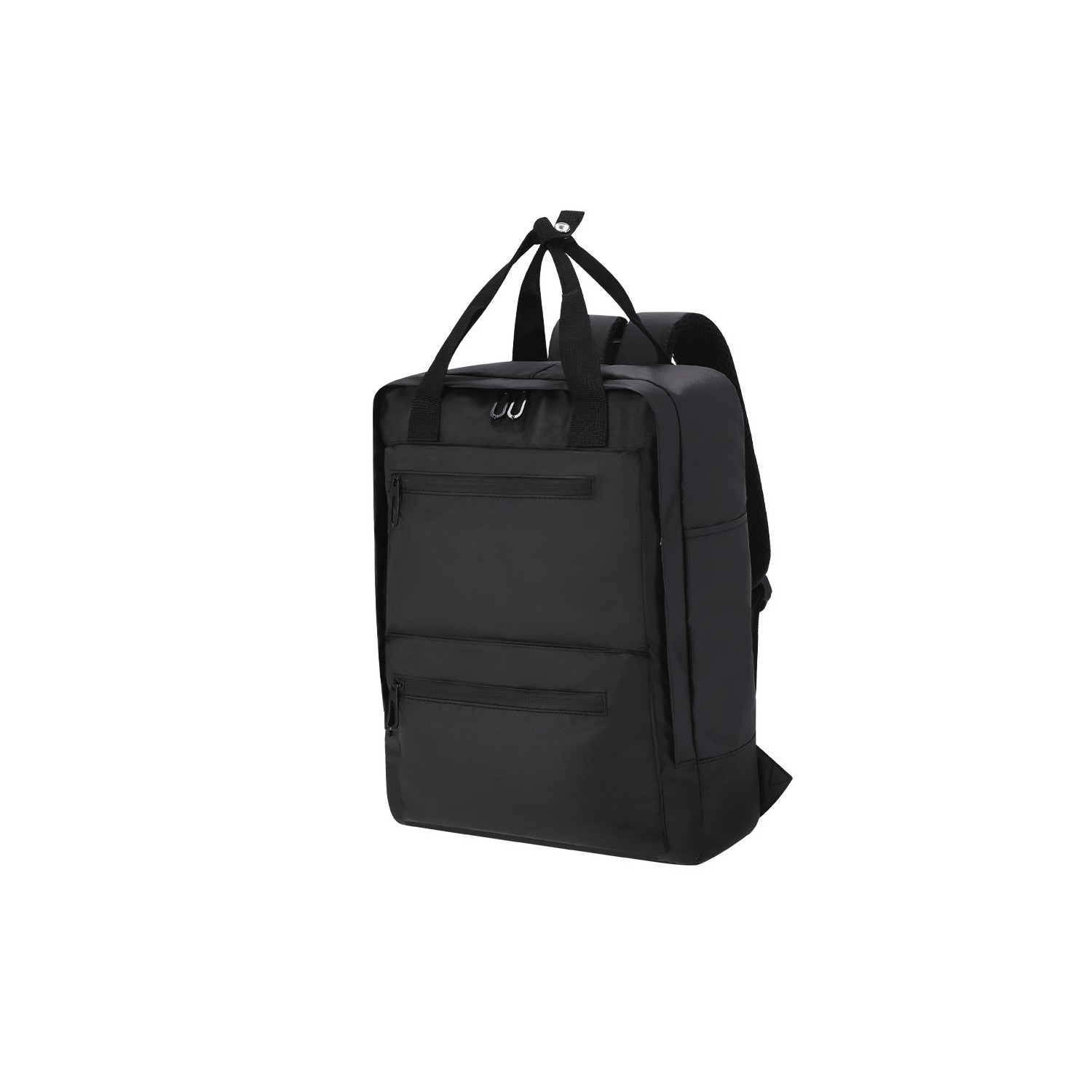 Zaino in PU resistente. Dotato di un compartimento principale e due tasche frontali per un rapido accesso. Chiusure con cerniera invisibili. Include due tasche laterali e maniglie doppie per il trasporto, rinforzate nella parte superiore con una cinghia di collegamento per un facile trasporto. Dotato di una tasca interna imbottita per laptop fino a 15 pollici e una tasca per tablet fino a 10 pollici. Spallacci e schienale imbottiti, traspiranti e regolabili.