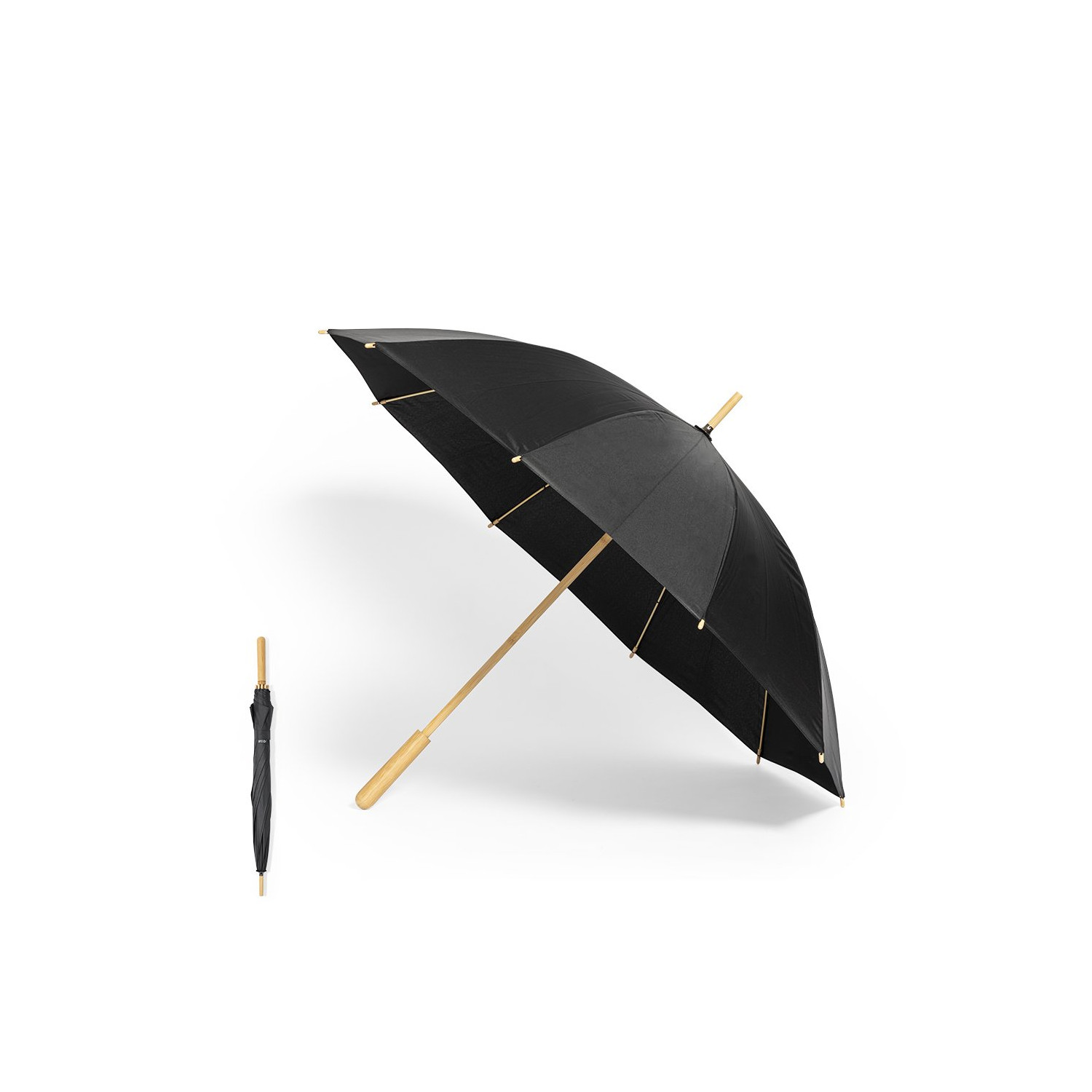 Ombrello con diametro da 105cm in materiale RPET pongee 190T. Apertura manuale e stecche in fibra di vetro antivento, elegante colore nero con chiusura in velcro. Manico dritto in bambù e caratteristica etichetta in RPET.Il materiale RPET è realizzato con plastica riciclata, in modo da incentivare il riutilizzo dei rifiuti plastici e aiutare la sostenibilità del pianeta.