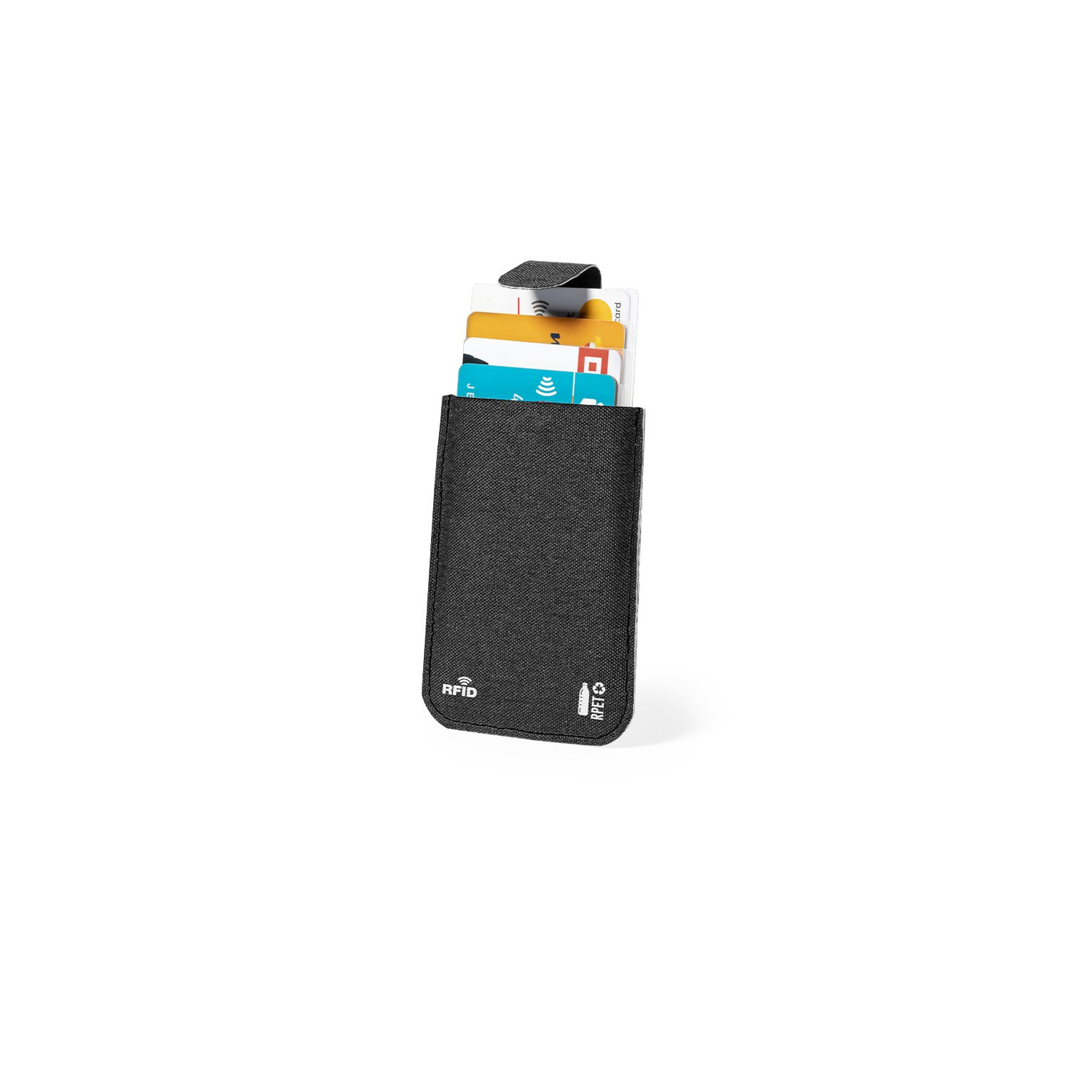 Elegante portacarte in poliestere RPET con finitura nera. Con chiusura magnetizzata, capacità di 5 carte e meccanismo di estrazione tirando la cinghia di chiusura. Con la tecnologia di sicurezza RFID (Radio Frequency Identification) che protegge i dispositivi di trasmissione dell'identità. Logo RPET e RFID all'esterno. Il materiale RPET è realizzato con plastica riciclata per incoraggiare il riutilizzo dei rifiuti plastici e contribuire alla sostenibilità del pianeta.