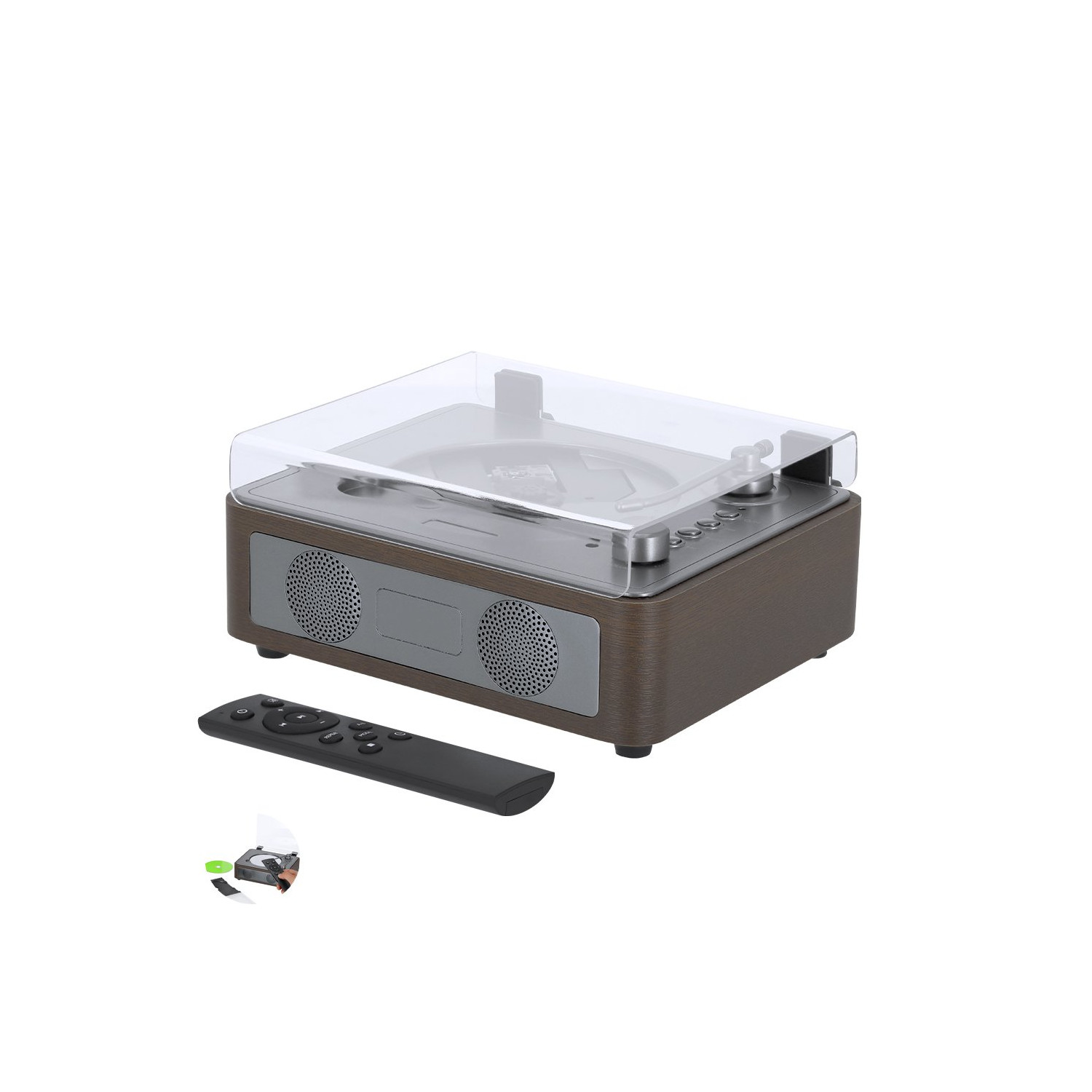 Riproduttore CD dal design retro, realizzato in legno, che consente di godere della musica mentre il disco gira sotto la sua copertura di acrilico trasparente. Dotato di una batteria da 2000 mAh, due altoparlanti integrati, connessione Bluetooth 5.3, e ingressi USB, Tipo C e per cuffie. Offre un utilizzo intuitivo con controlli per volume, riproduzione, cambio tracce e pulsante play/pausa, disponibili sia sul dispositivo che sul suo telecomando. Istruzioni d'uso disponibili in spagnolo e inglese.