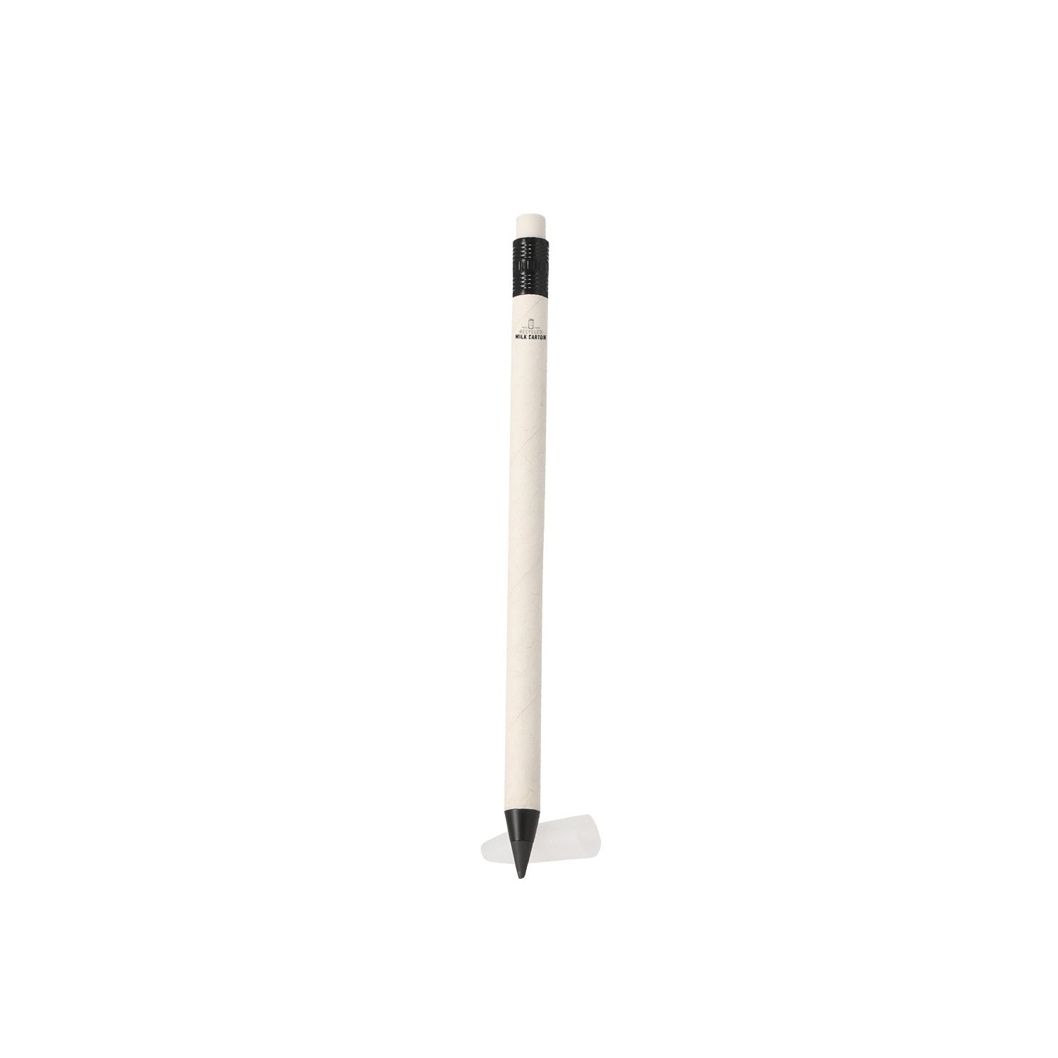 Matita eterna realizzata con cartoni del latte riciclati. Riutilizzabile e con scrittura infinita. Con gomma sulla parte superiore della matita. In bianco, con dettagli neri. Con logo del cartone del latte riciclato sul fusto.I cartoni del latte sono composti principalmente da cartone e alluminio. Durante il processo di riciclaggio, i diversi materiali di imballaggio vengono separati per il riutilizzo e il riciclo, contribuendo così al percorso infinito dell'economia circolare. Questo materiale è noto per la sua alta riciclabilità, nonché per la sua leggerezza e resistenza.