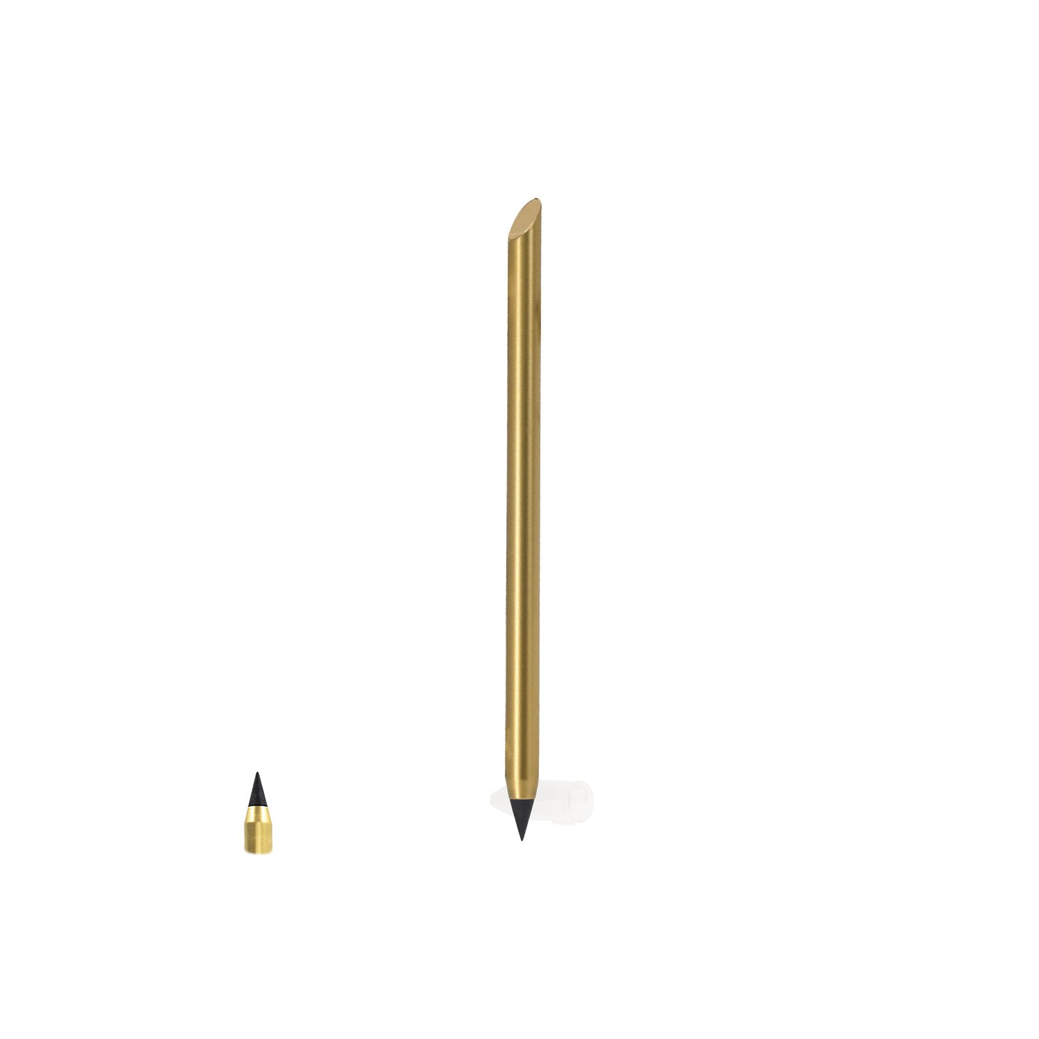 Matita eterna realizzata in alluminio riciclato. Riutilizzabile e con scrittura infinita, per usare sempre la stessa matita senza produrre rifiuti. Include distintivo in alluminio riciclato sulla parte superiore e copertura protettiva per preservare la punta in grafite.