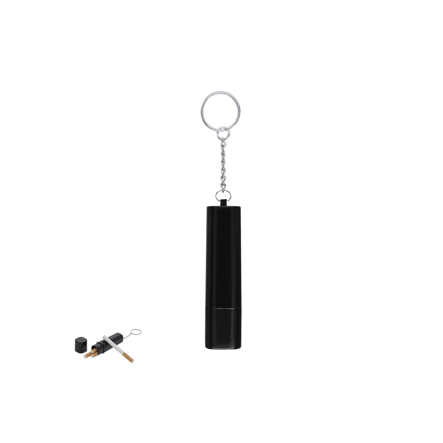 Pratico portachiavi custodia per tabacco di design compatto, ideale per un trasporto comodo. Offre capacità per quattro sigarette con un coperchio rimovibile e anello portachiavi in metallo.